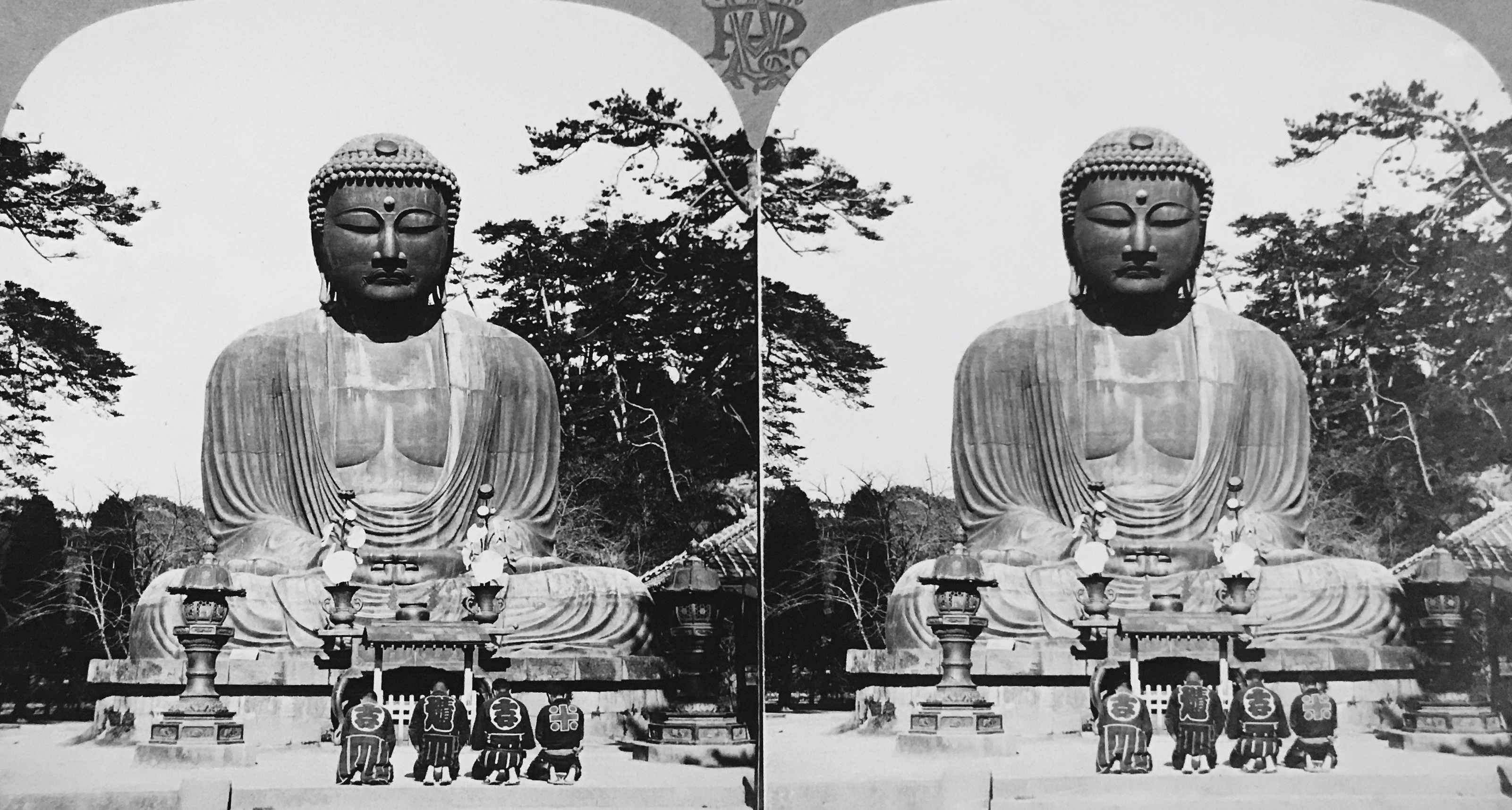 Ponting’s image of the Daibutsu is uncommon in several regards. It gives significant visual weight to the row of four Japanese men kneeling, eyes downcast, in apparent reverence to the Buddhist image. This kneeling posture is almost unique among the dozens of stereo-photographs of this temple scene. Indeed, the only other image with kneeling supplicants I have encountered I suspect to also be under Ponting’s artistic direction. The orchestration of such a scene should not be too surprising. The visual cue of kneeling would immediately signal to a Western audience a pious act of religiosity. The caption on the card also makes it apparent that the act of worshipping is to be highlighted, as are the non-aesthetic religious dimensions of the statue, which is clearly labeled an “idol.”