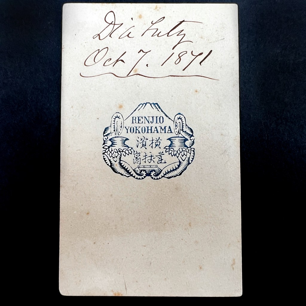 This is a bronze statue of Amida Buddha dating to the 13th century. The small format carte-de-visite (CDV) print shown here is hand dated to October 7, 1871 – possibly the date when a tourist visited the Daibutsu site. Renjō’s stamp identifies him as the photographer.
