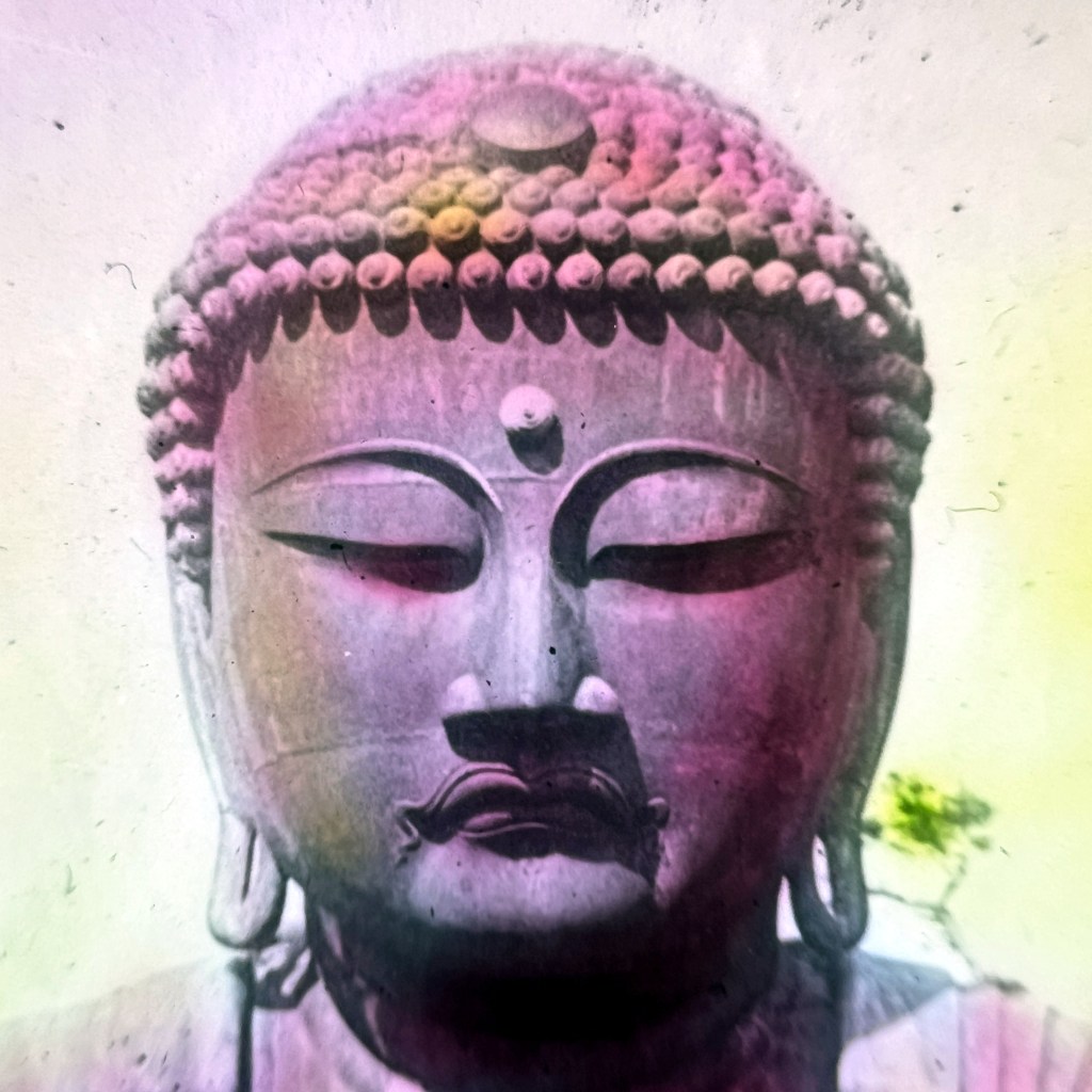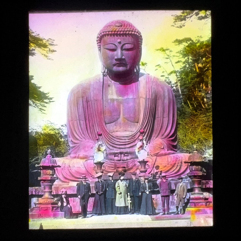 While photos and postcards were shared with friends in the home, glass lantern slides were also intended for showy public display. Consequently, glass slides were often hand-painted in eye-catching color; here we see the bronze Kamakura Daibutsu in uncharacteristic magenta.