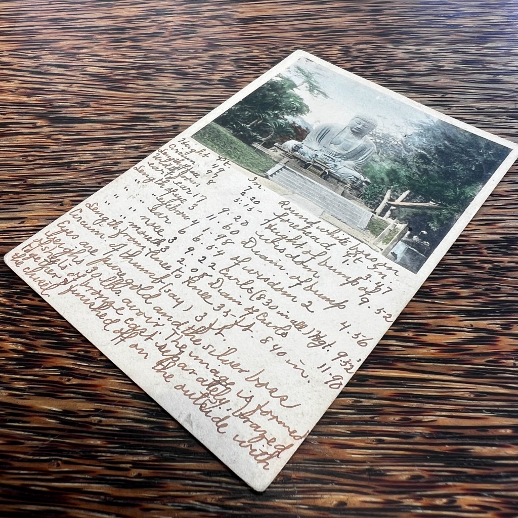 Used postcards are valuable because they reveal which aspects of the Kamakura Daibutsu site in Japan were more salient to visitors. The exact measurements given here were not taken on site by the visitor, but were likely copied from one of the popular Japan tourism guides.