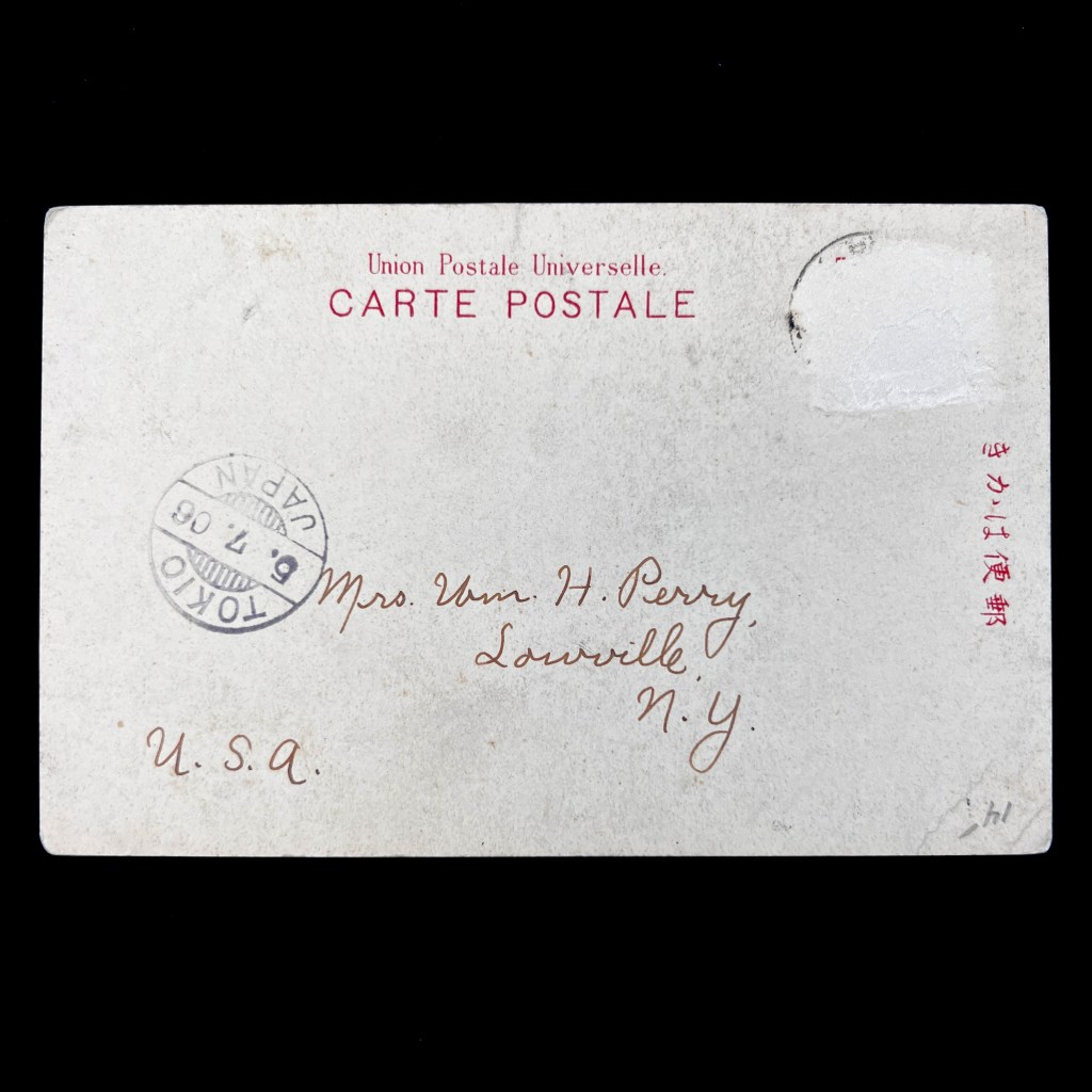 The reverse gives us some insight into the “extended biography” of the postcard after its departure from Tokyo. Notably, the missing postage stamp suggests it was prized by a philatelist – a stamp collector.