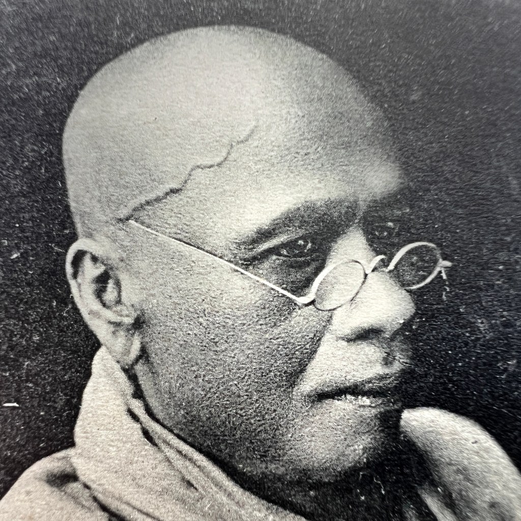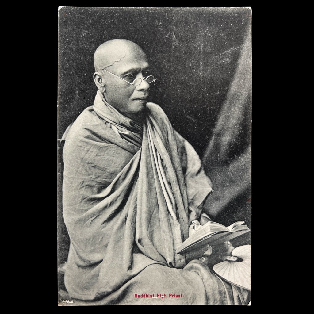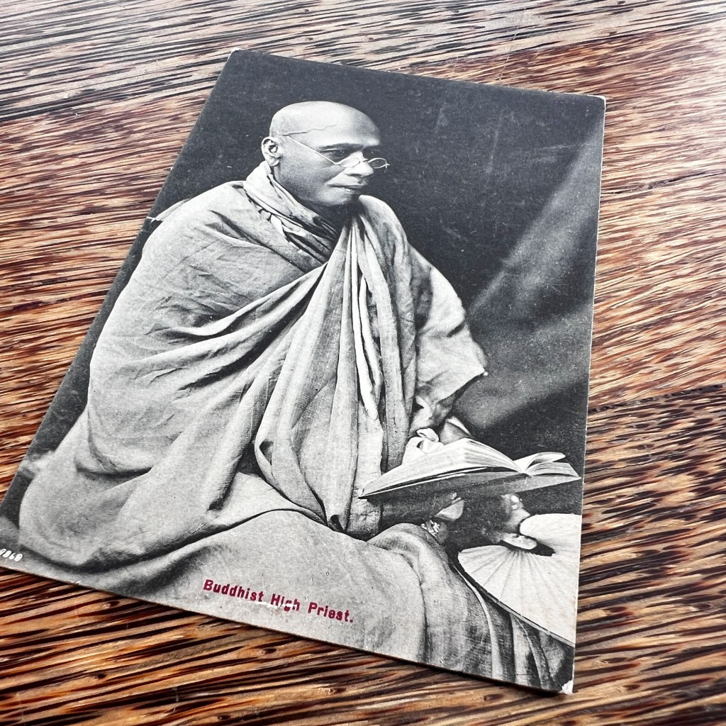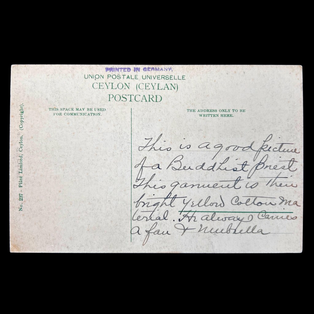 The photograph was taken in the 1890s by the first private studio to sell postcards in Sri Lanka, A. W. Plâté & Co. The previous owner of the card used it to take travel notes, detailing the “bright yellow” color of monks’ robes and their frequent use of palm leaf fans and umbrellas.
