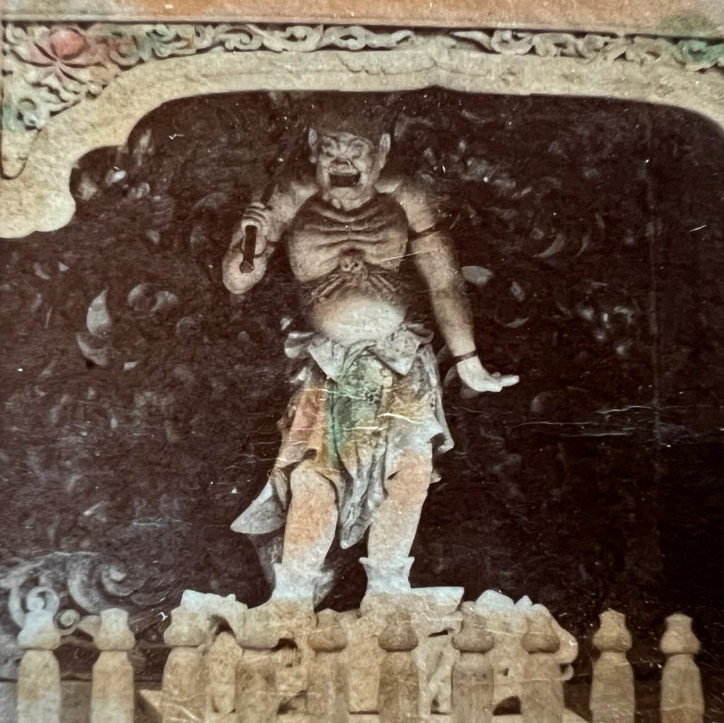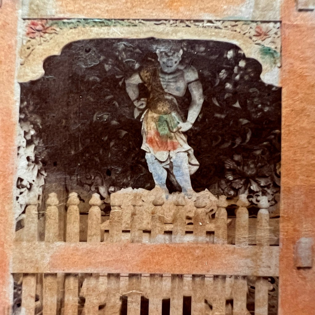 The fierce white-skinned yakṣa on the right is Kendara who carries a weapon on his shoulder.Due to the warrior nature of these images another name for this gate was sometimes used in turn-of-the-century guidebooks: the Demon Gate.