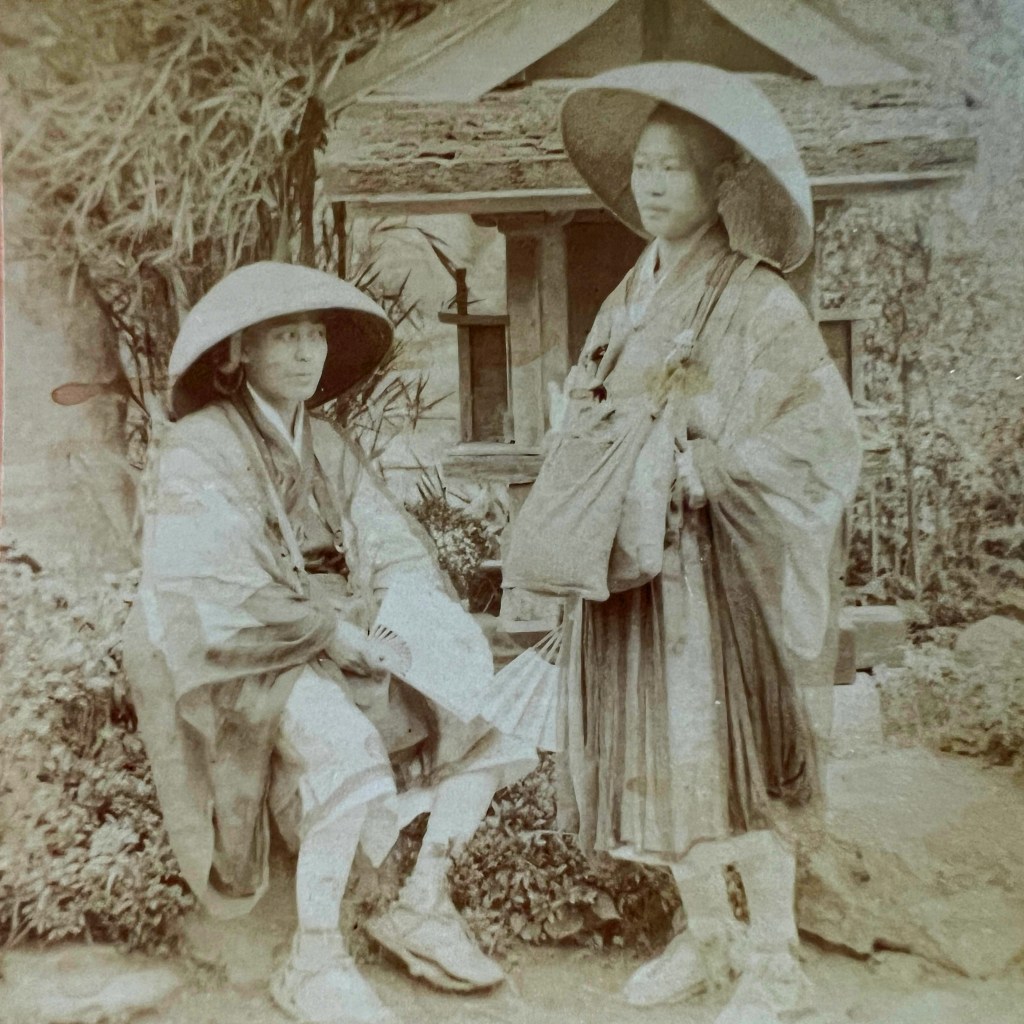 This view is captioned, “Buddhist Priests on a Pilgrimage, Japan,” but we have no precise information regarding the location. The negative number (13978) places this image in a series taken around Mt. Fuji, thus it may be somewhere on the pilgrimage path to the sacred mountain.