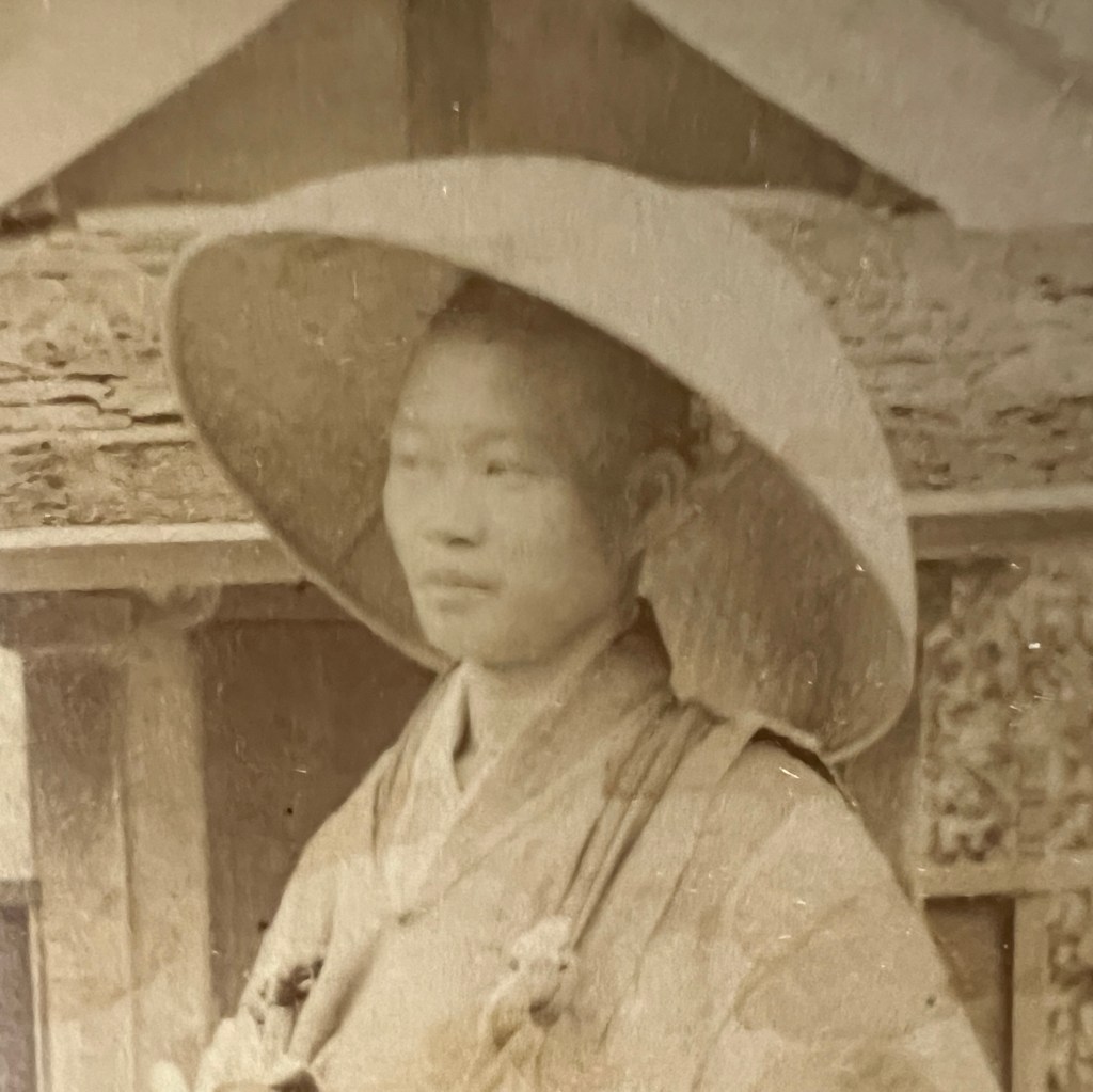 The sedge hats, bags, and white clothes all signal the activity of a religious pilgrimage. Views such as this were considered educational as much as they were entertaining and thus reflected a visual tradition of anthropological photography by showing native peoples in religious attire.