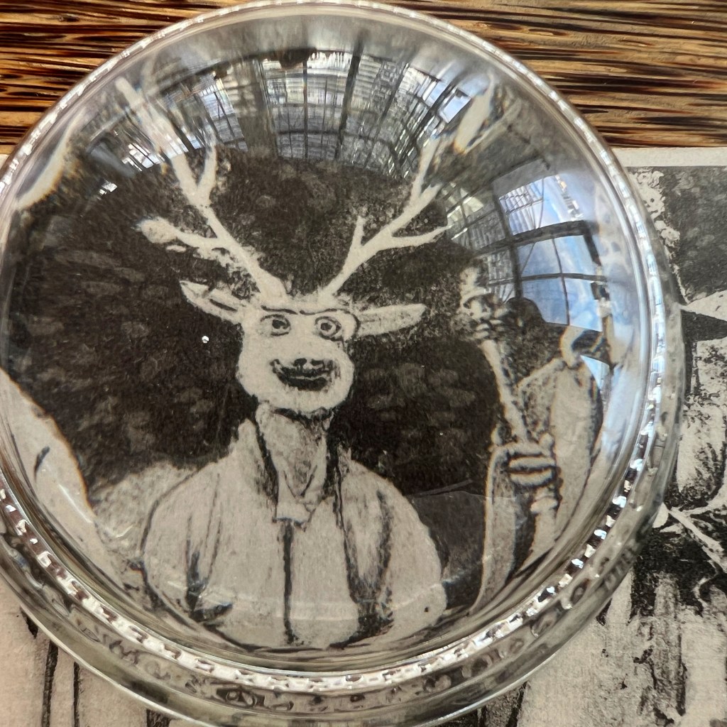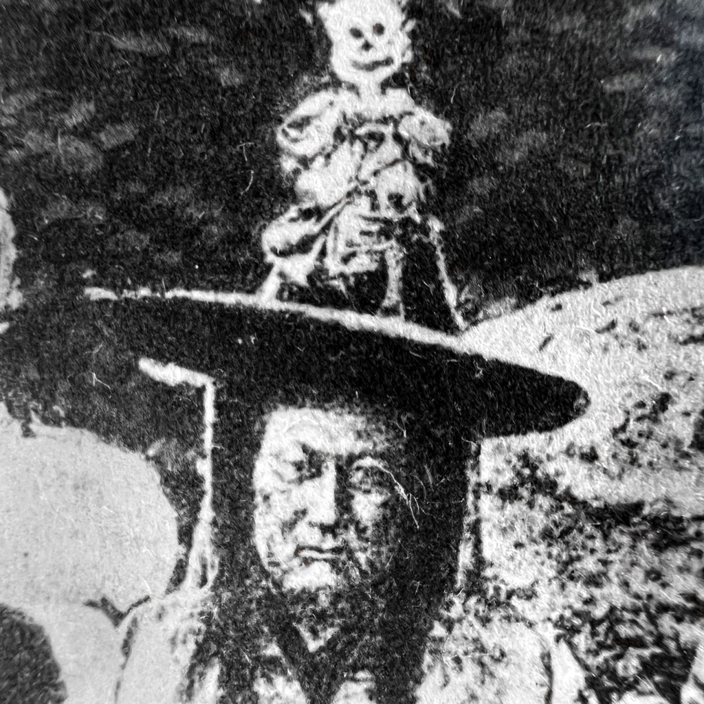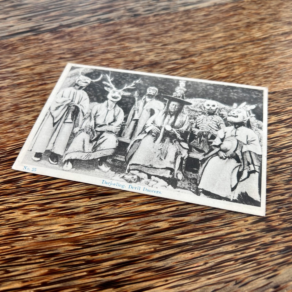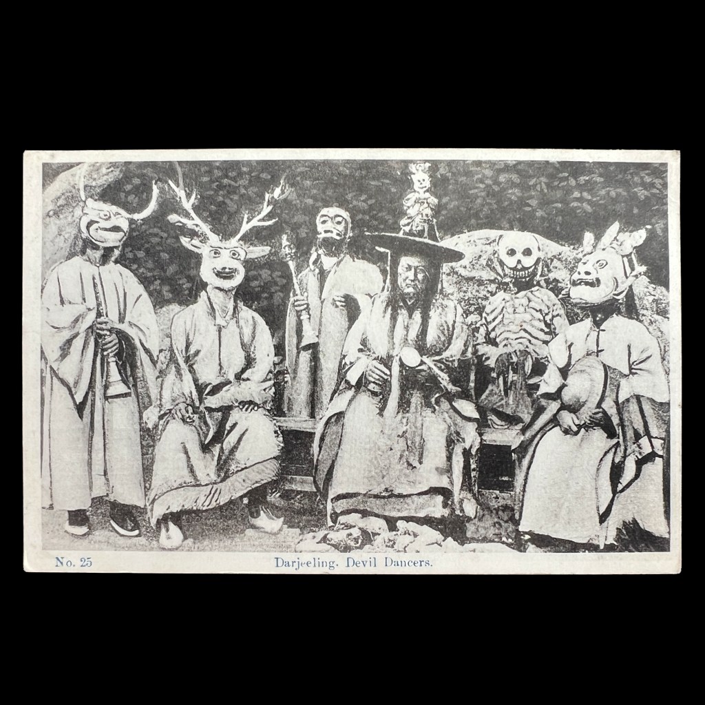 The stag mask recalls a dance symbolizing the repulsion of negative forces and the consecration of surrounding space for spiritual practice. One source claims this photo was taken in Bhutia Busty, a village in the Darjeeling district known for its cham performances at the local monastery.