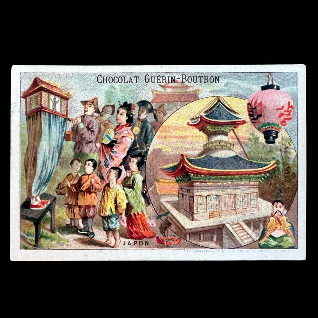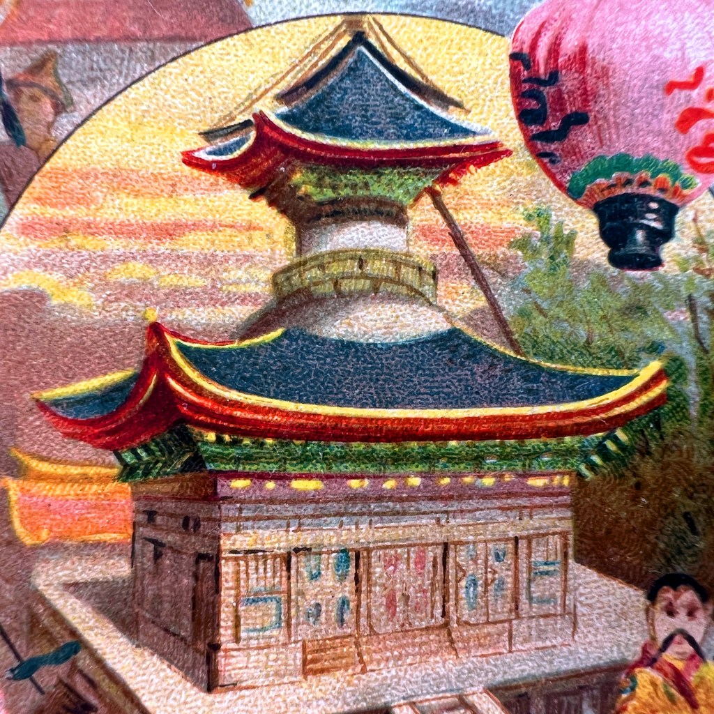 By the turn of the 20th century advertising cards were sought-after collectables, often pasted alongside other printed ephemera inside scrap books. The main visual language was the stereotype, and places like Japan were depicted as a mélange of mystery, pagodas, and odd idols.