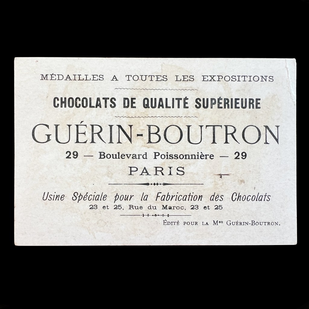 Guérin-Boutron was a luxury Parisian chocolatier and early adopter of chromolithographed trade cards, creating this set of worldwide nations and cities in the early 1900s.The printer, Vieillemard Fils & Cie, was a premier lithographer for major French trade card producers of the era.