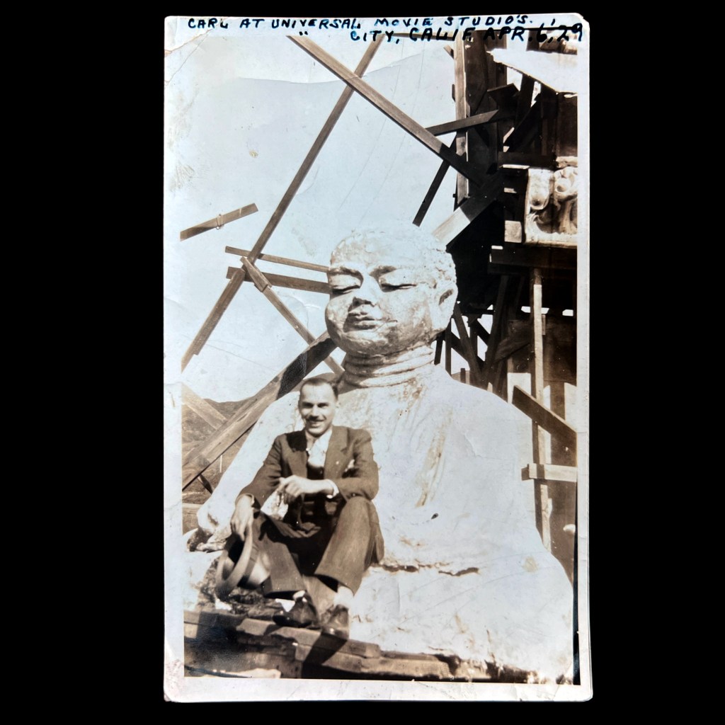 An inscription dates the photo to 1929. At this time Charles Hall was the art director for Universal, famous for his gothic aesthetic seen in the classic films Phantom of the Opera, Dracula, and Frankenstein. Was this buddha statue a creation of Hall for a new Universal film?