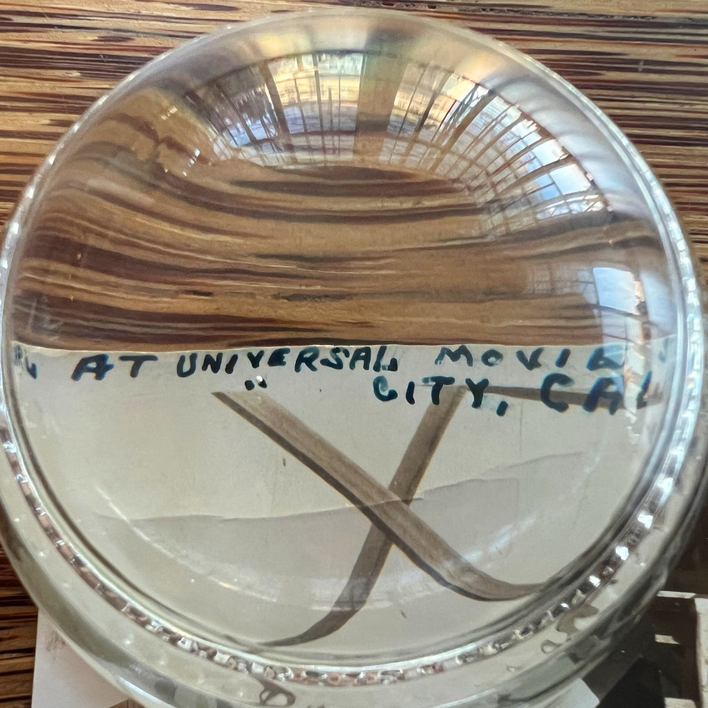 When Carl Laemmle opened Universal City in 1915, it garnered such public acclaim he decided to make studio tours a permanent attraction. Here we see a photograph (and duplicate) of the Universal back lot where a visitor sizes up one of the plaster buddhas on display.