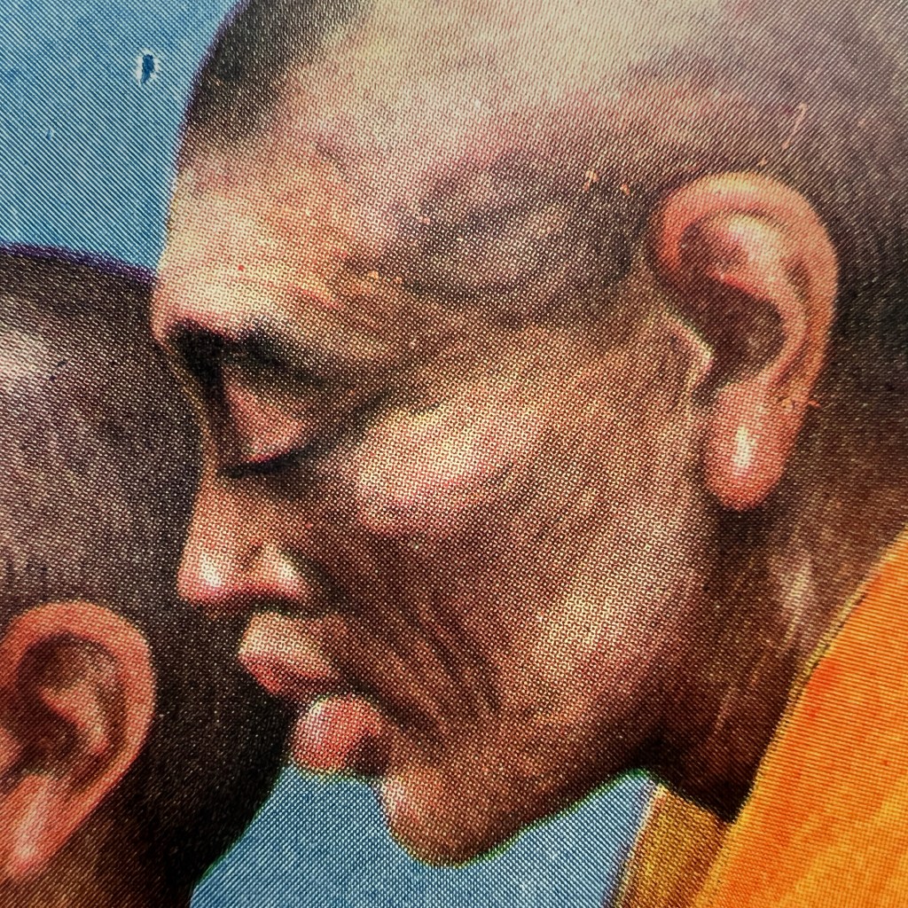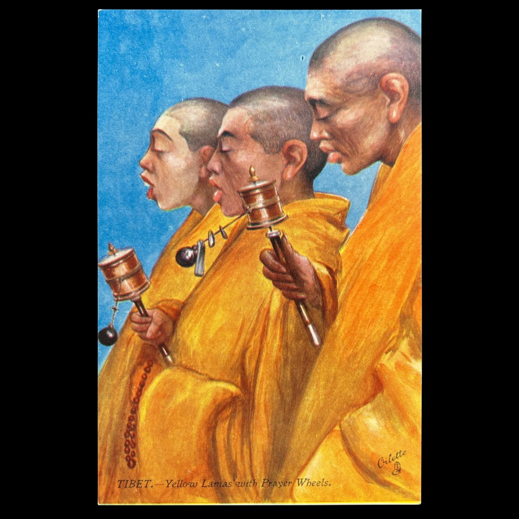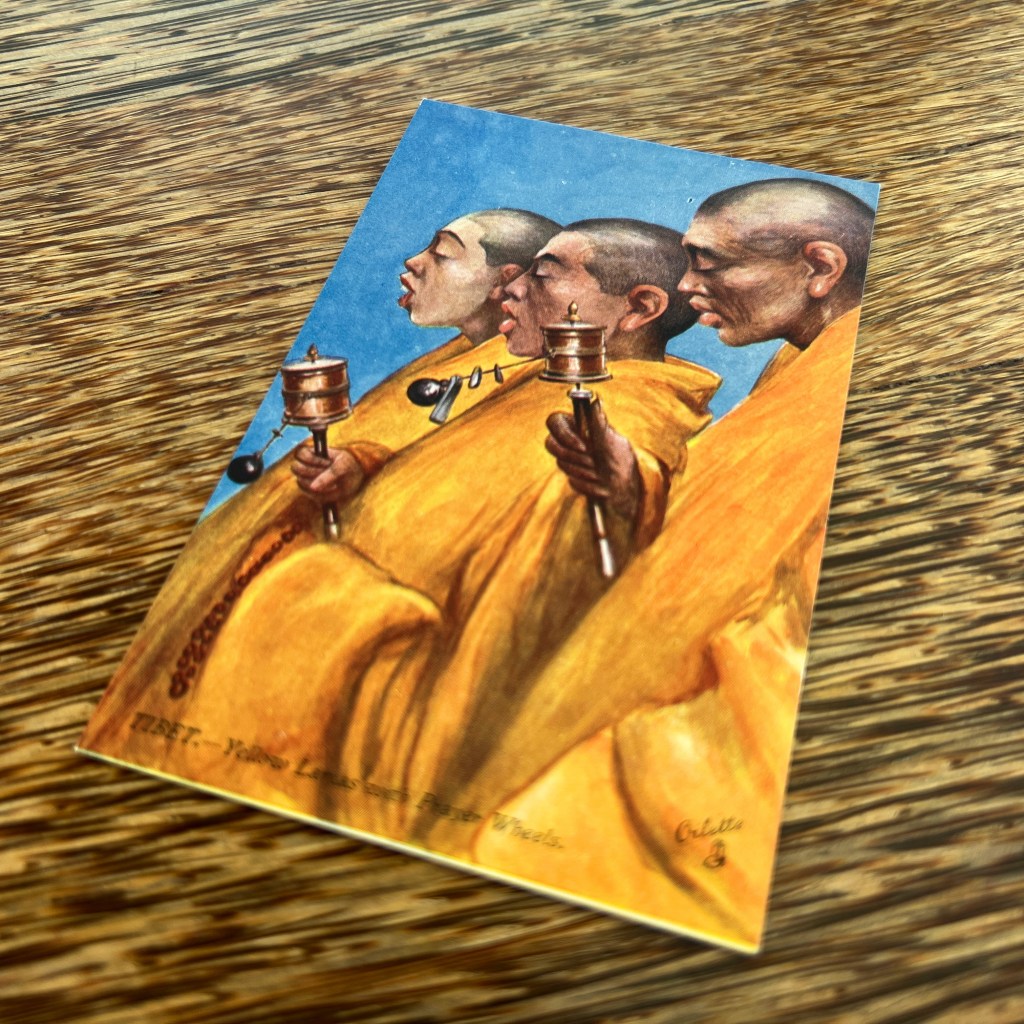 While a majority of Tuck’s pictorial stock focused on the English countryside, the Wide Wide World Series introduced colonial lands and other foreign cultures. Here the caption notes the use of Om mani padme hum, a six-syllable Sanskrit mantra common among Tibetan Buddhists.