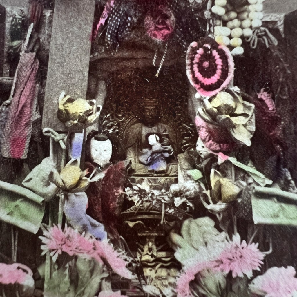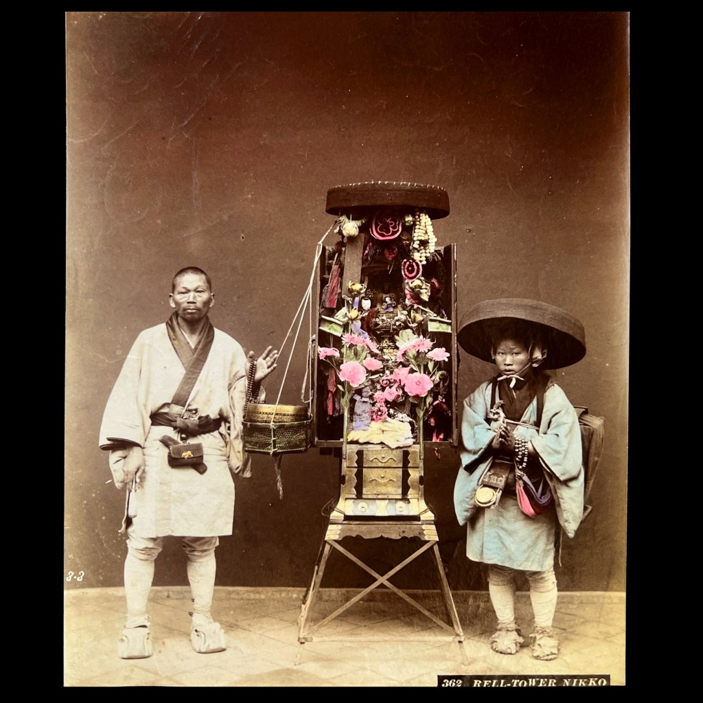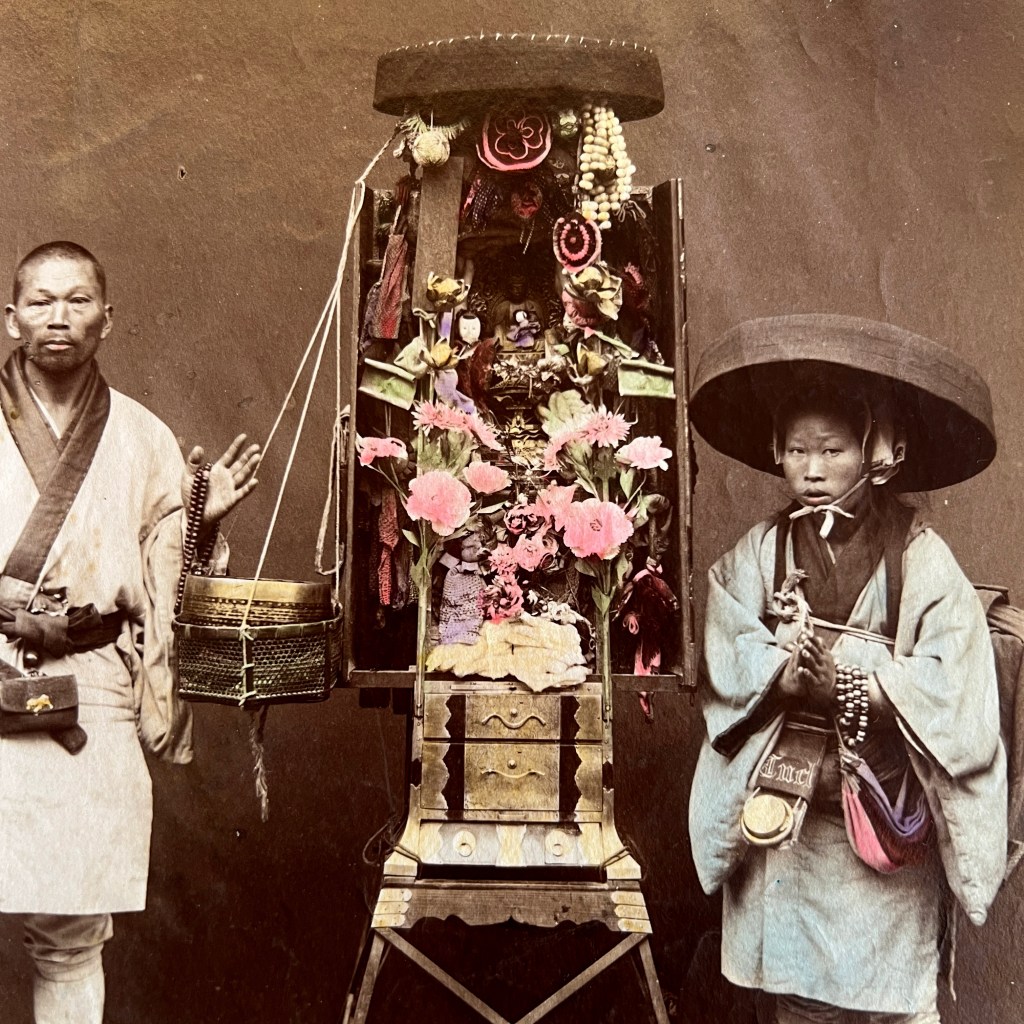 While temple visitors might view Buddhist images as immovable fixtures, Meiji-era photography reveals the remarkable portability of Buddhist icons. Here we see a pair of Japanese pilgrims with their portable shrine traveling through Nikko, a sign of Buddhist faith on the move.