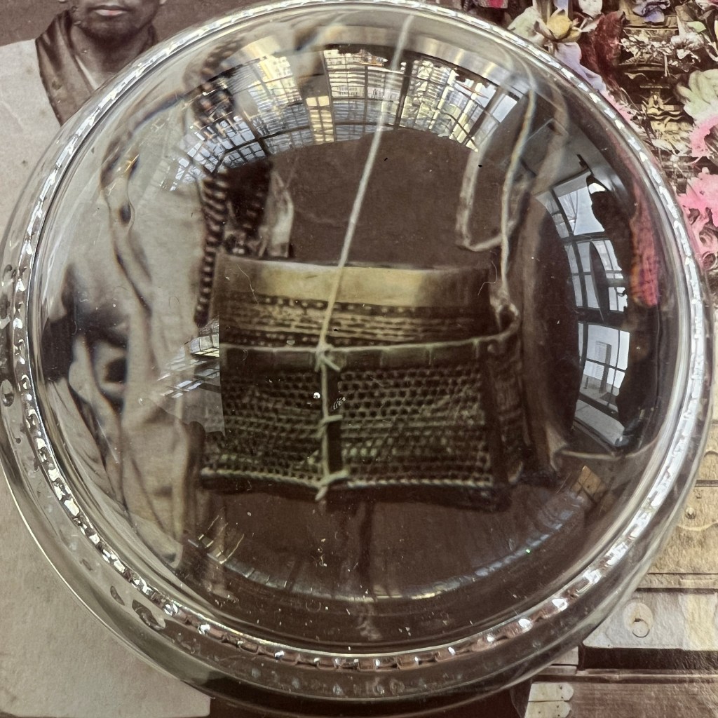 Pilgrims would carry the frame on their backs as they moved from one location to the next. A large bell rests in a basket hung off the side, ready to be struck by a mallet held in the pilgrim’s hand on the left. His other hand holds a long string of mala beads.