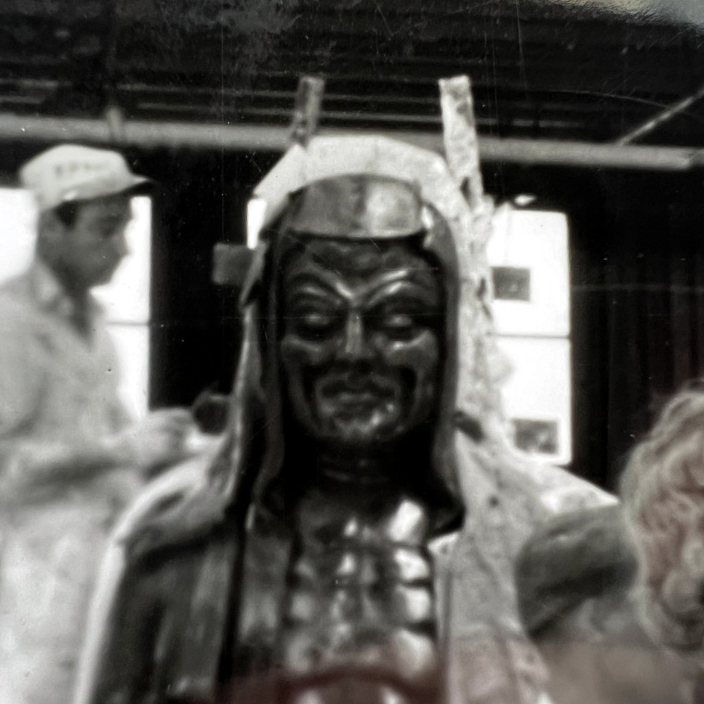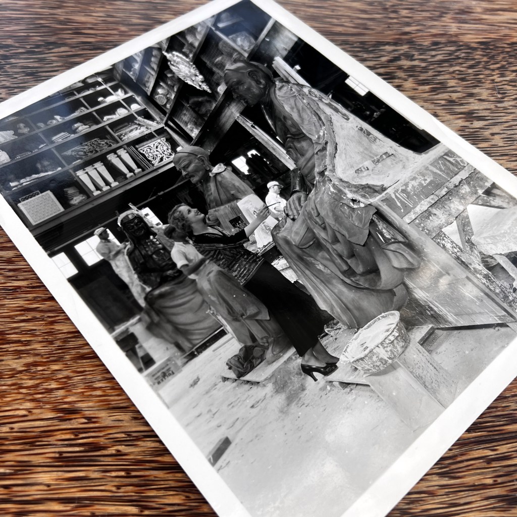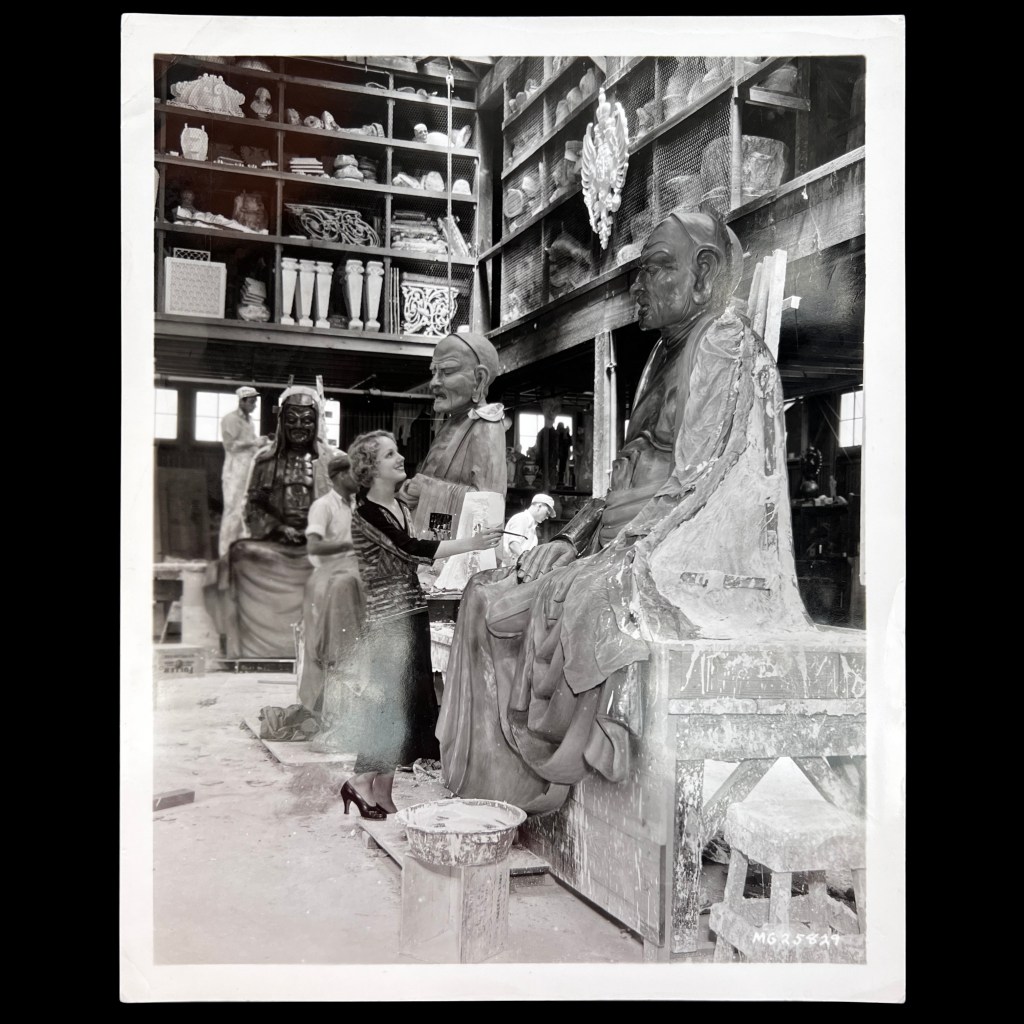 In this behind-the-scenes photo from The Mask of Fu Manchu (1932), MGM’s workshop prepares towering Buddhist statues for use as set design. Despite present-day associations with peace, art director Cedric Gibbons relied on this monumental Buddhist imagery to evoke mystery and danger.