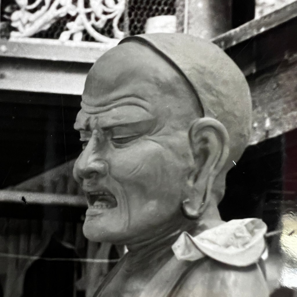 Gibbons made faithful reproductions of arhat statues, figures known in East Asia for having exaggerated and misshapen bodies and heads–signs of their supernatural attainments. These facts were unknown to most audiences who would have viewed them as expression of Fu Manchu’s grotesque villainy.