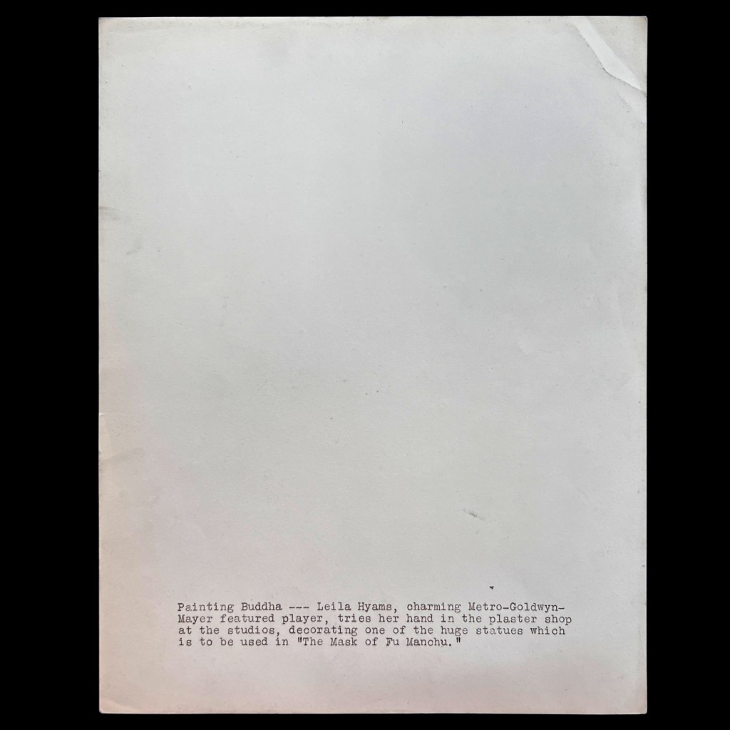 As typed on the back, the woman in the photo was Leila Hyams, an MGM studio actor who did not appear in The Mask of Fu Manchu, but had starred in MGM films since 1928.