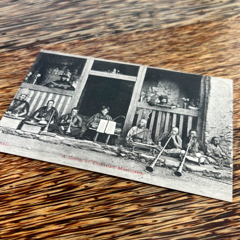 Despite the ambiguous caption—”A Group of Thibetan Musicians”—the history behind this anonymous photograph is remarkably well-documented. Taken by Robert Phillips before 1873, we see a gathering of the resident lamas at Sangchen Thongdrol Ling, a Nyingma monastery in Darjeeling.