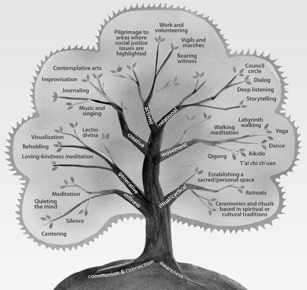 A diagram called the Tree of Contemplative Practices is used to represent the range of contemplative activities organized into several clusters: activist, creative, generative, movement, relational, ritual or cyclical, and stillness [Fig. 1]. A quick glance reveals that the specific practices outlined are far more diverse, and far more interdisciplinary than one would typically see in traditional university classroom settings.[17] They are rooted, literally in the case of this diagram, in communion, connection, and awareness. This is just one example of how CP is believed to impact both the personal and social domains.