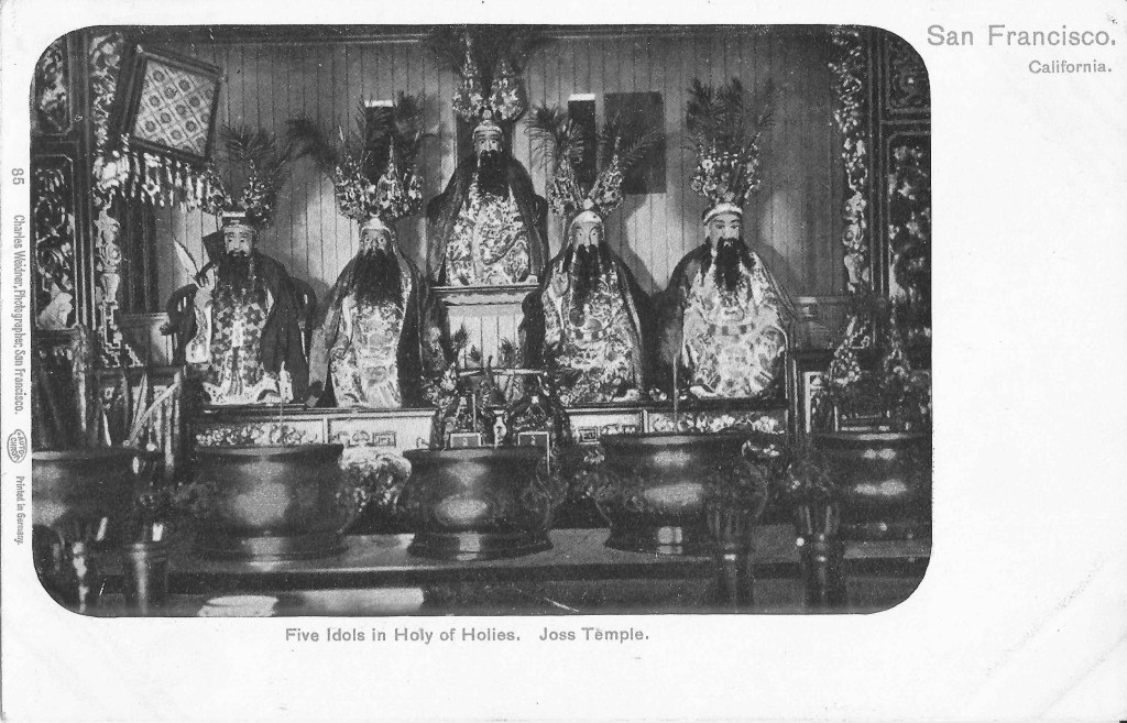 This map and commentary identifies many of the Chinese temples constructed in San Francisco prior to the 1906 earthquake and fire. Known generically as miao 廟 (or miu in Cantonese), meaning temple or shrine hall, these structures were commonly referred to as “joss houses” by the non-Chinese American public. A principal function of these temples was to enshrine Chinese religious icons, known commonly as “joss,” and house other ritual equipment relevant to religious practice and worship.