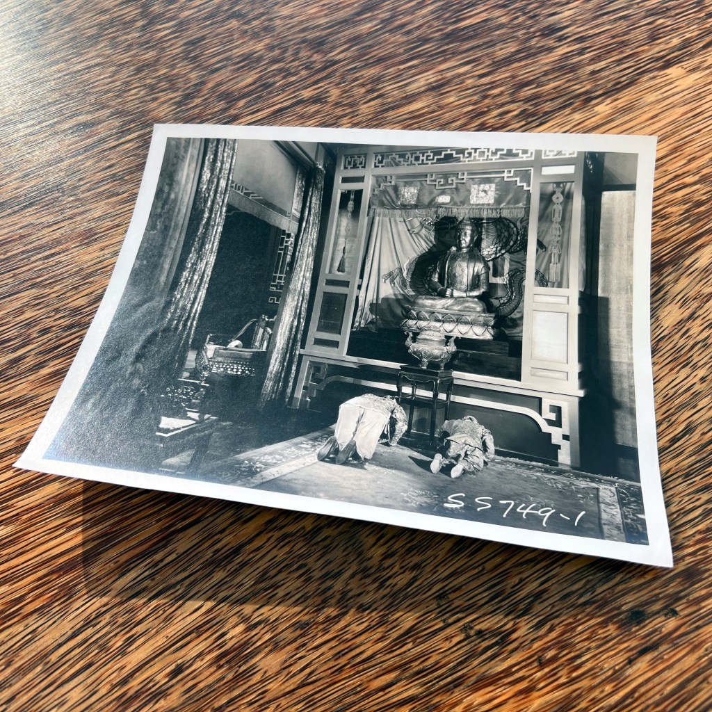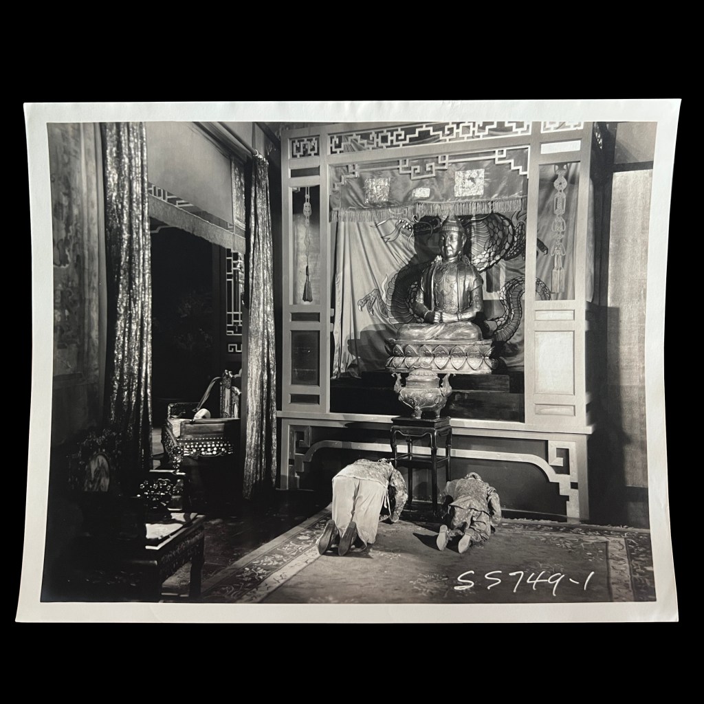 This photo casts a rather uncanny site with unnaturally bright side lighting, awkwardly wooden human figures, and a very odd Buddhist icon. This is not a real Chinese Buddhist temple, but a movie set designed for a famous 1929 Paramount film.