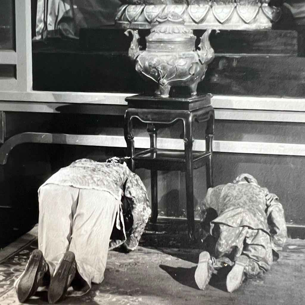 The prostrating mannequins represent the doctor’s family praying at the family shrine moments before the altar is destroyed by a shell, crashing rubble on top of them. Fu Manchu swears vengeance in front of his dead family and demolished Buddhist icon.