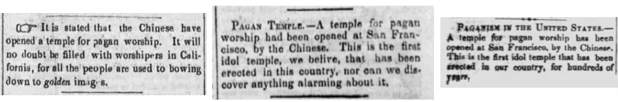 Figs. 1-3: Newspapers discussing the first Chinese “idol temple” in San Francisco; Portsmouth Inquirer, 1851 December 5. | South Western Baptist, 1851 November 26. | Beloit Wisconsin Free Press, 1851 Nov 13.