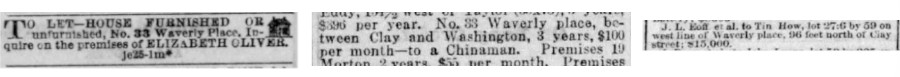 Despite the widespread claim that the Tin How Temple on Waverly Place dates to the early 1850s, no contemporary historical documentation supports this assertion. The earliest evidence for a Tin How Temple on Waverly appears in June 1877, while the name “Tin How” first appears in a property sale record from 1876. Notably, however, by June 1877 Waverly Place—the two-block street connecting Sacramento and Washington Streets—was already known among the Chinese community as Tin How Temple Street (Tianhou miao jie 天后廟街). This area would later contain the highest concentration of Chinese temples prior to the 1906 earthquake.