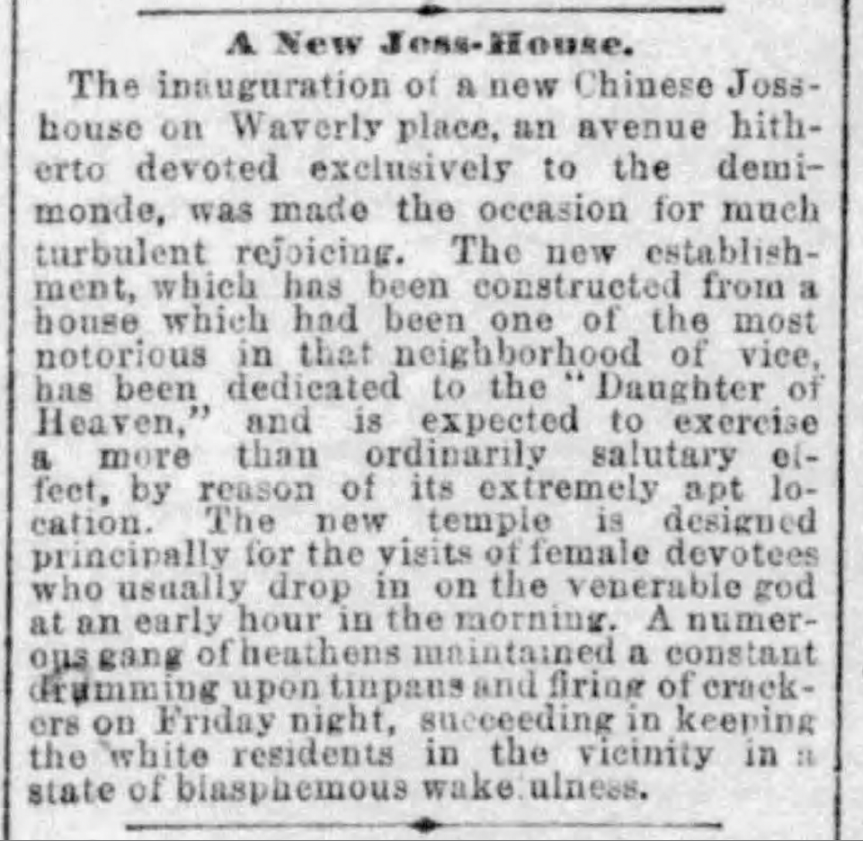 The identification of a joss house on Brenham Place is complicated by the record of a Shin Shee Nue [sic] joss house at 2 Brenham Place, first seen in the city directory of 1881. The existence of a “Sin See Mu Society” on Brenham is also reported in the summer of 1882 when a festival and parade was held for its “wooden” icon, described as a “violent-looking old gentleman” with his “right hand stretched far above his head.” This icon was not the one ensrined in the temple, but was burned at the end of the celebrations, as was common practice. In the summer of 1884 a newspaper recounts the celebrations of the “Shim Shee Mue” on Brenham and during the following summer of 1885 we again find a report covering the birthday celebrations of a “Wong Tung Shim Shee Mue.”