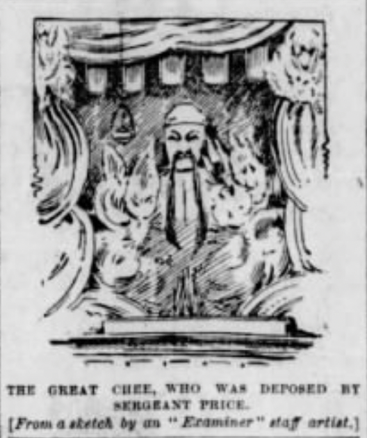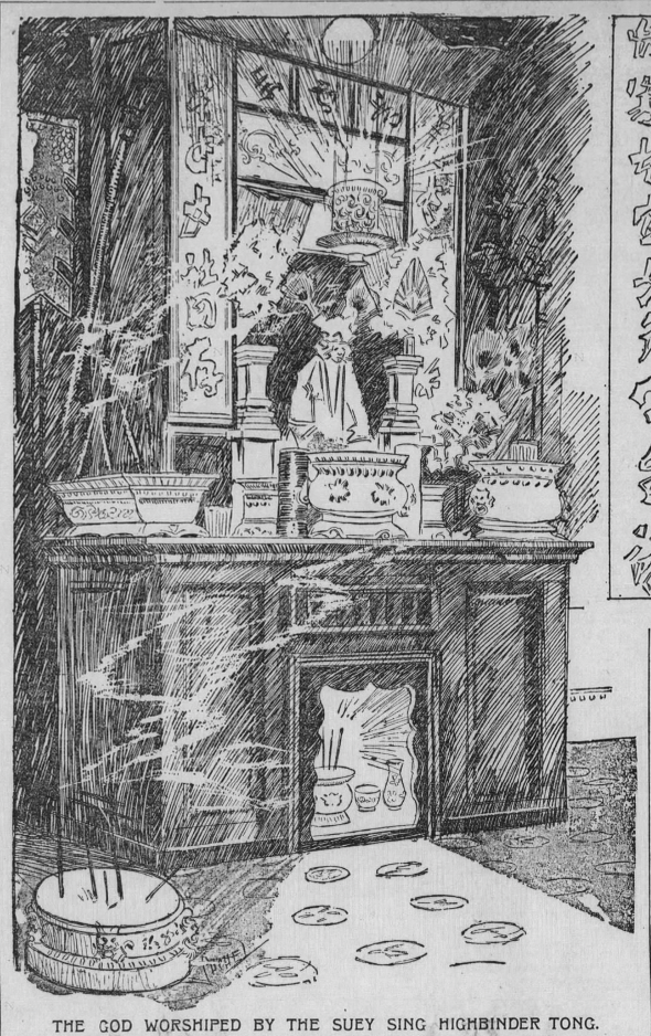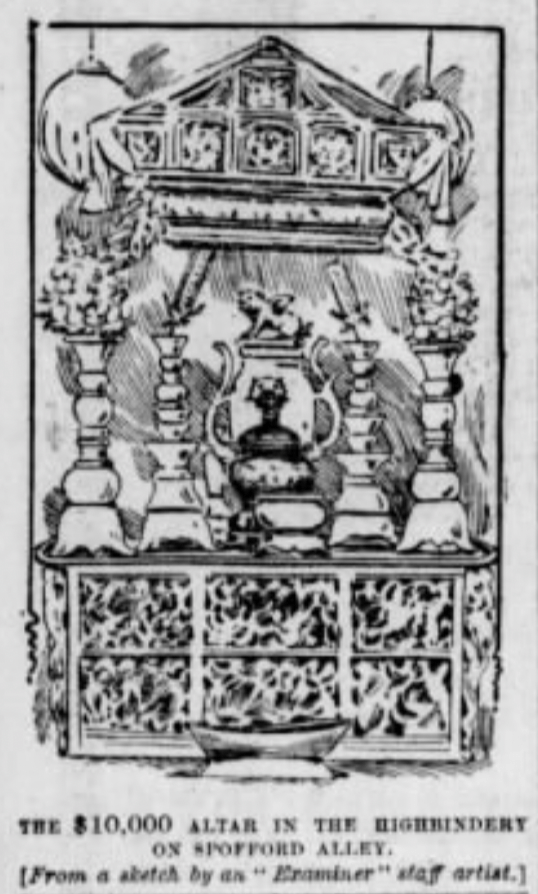 In 1897, during heavy police pressure to solve the murder of secret society leader Fong Ching, known as “Little Pete,” the Suey Sing evacuated their headqarters fearing they were being fingered by the police. When the Chinatown squad arrivled at 1004 Dupont (some reports confuse the address with the Suey Ying meeting rooms at 1 Brenham), the main icon had already been removed and the altar dismantled. The San Francisco Examiner sketch artist apparently decided to envision what the altar may have looked like if it was still set up fully (see below).