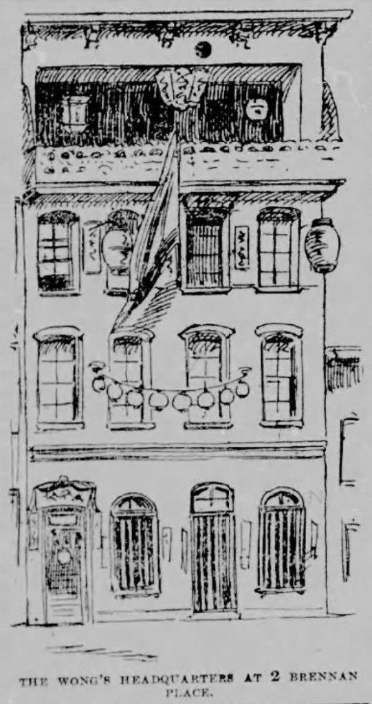 To complicate matters further, by 1892, the Wong family is described as occupying 2 Brenham Place, a address repeated in 1893 when they held a birthday celebration for their patron goddess, Guanyin. The history of this “move” is not straightforward. According to Ho and Bronson, this represented a new four-story building built in “early 1890” with a top-floor shrine hall dedicated to Water Moon Guanyin. If a newspaper sketch from 1893 is accurate (see below), this appears to be a new construction over the old footprint of 3 Brenham, meaning the building was renumbered to 2 Brenham. The street renumbering may have occurred after the Porthsmouth House on Clay was demolished in the latter half of the 1880s and rebuilt as a four-story brick building. (This would place the Wong clan building at 7–9 Brenham Place on the 1905 Sanborn map [here].)