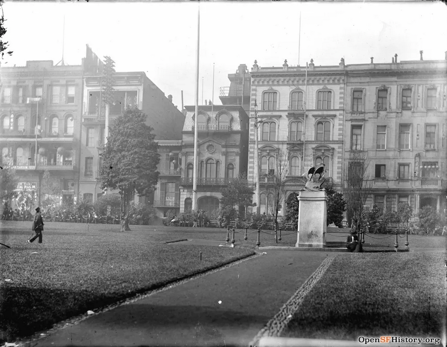 Anonymous, “Brenham Place, west Side of Portsmouth Plaza. Monumental Engine Co. ca. 1880” c.1880. [source]