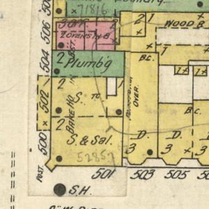 The 1885 Board of Supervisors’ Map identifies a joss house at this location, most likely referring to the Yeong Wo temple. By contrast, the 1887 Sanborn Map shows no temple at this address, suggesting that it was prepared after the Yeong Wo Association, had moved but before the Golden Flower Temple was established.