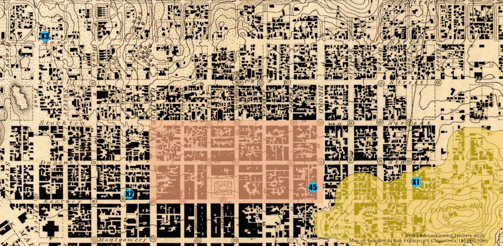 It should be emphasized that Yeong Wo temple, Sze Yap temple [#X2], and Ning Yung temple [#45] are now recognized as the three oldest Chinese American temples in San Francisco, having been built and subsequently dedicated in 1851/1852, 1853/1856, and 1864, respectively. The privately owned temple dedicated to Tianhou [#X3] appears in records starting in 1868, but may have been in operation much earlier. All four locations are on the margins or beyond the bounds of the area that came to be formally recognized as San Francisco’s Chinatown.