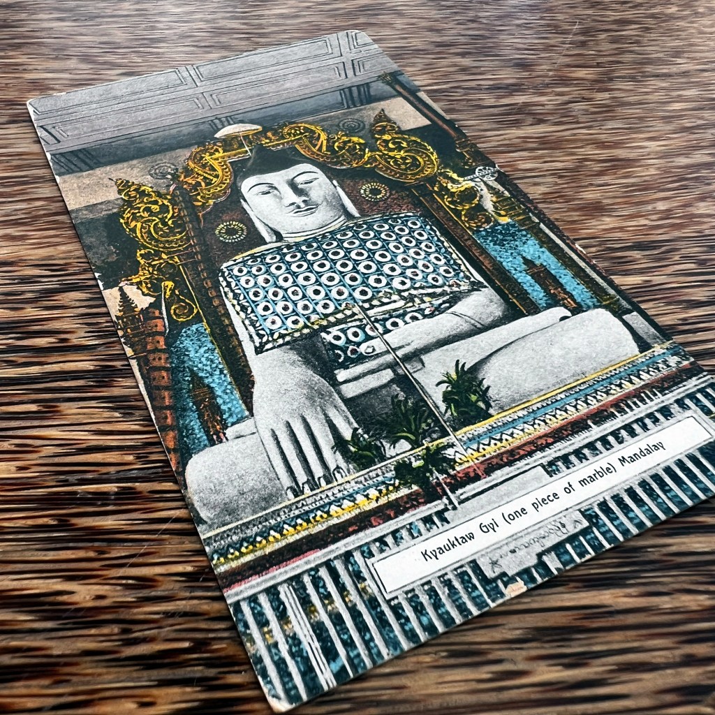 At the height of the worldwide postcard craze, no one produced more vibrant imagery of the Buddhist world than D.A. Ahuja. Here we see Myanmar’s 17th century Kaunghmudaw Pagoda with unique hemispherical dome – most Burmese pagodas are pyramidal structures.