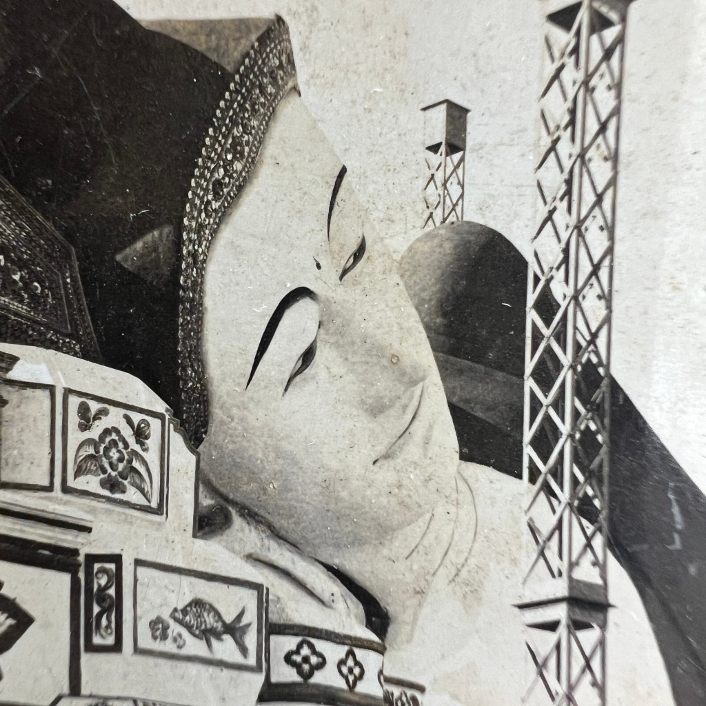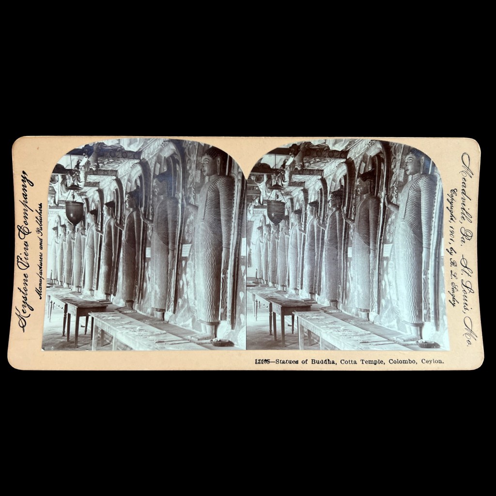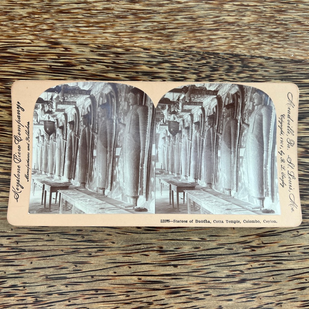 Marketed as education material, the information on the back of this stereoview offers a few generic facts about Buddhism. The unknown author also offers pointed criticism, calling the statues on the front “rigid” and chastising Buddhists for being “practically idolatrous.”