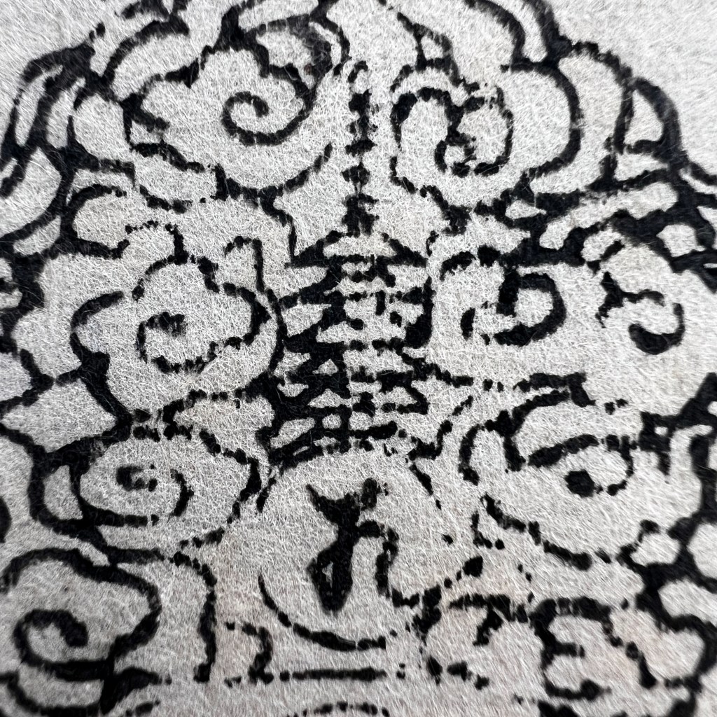 The markings on the pedestal are meant to signify non-alphabetic East Asian writing, but none can be resolved into legible characters.