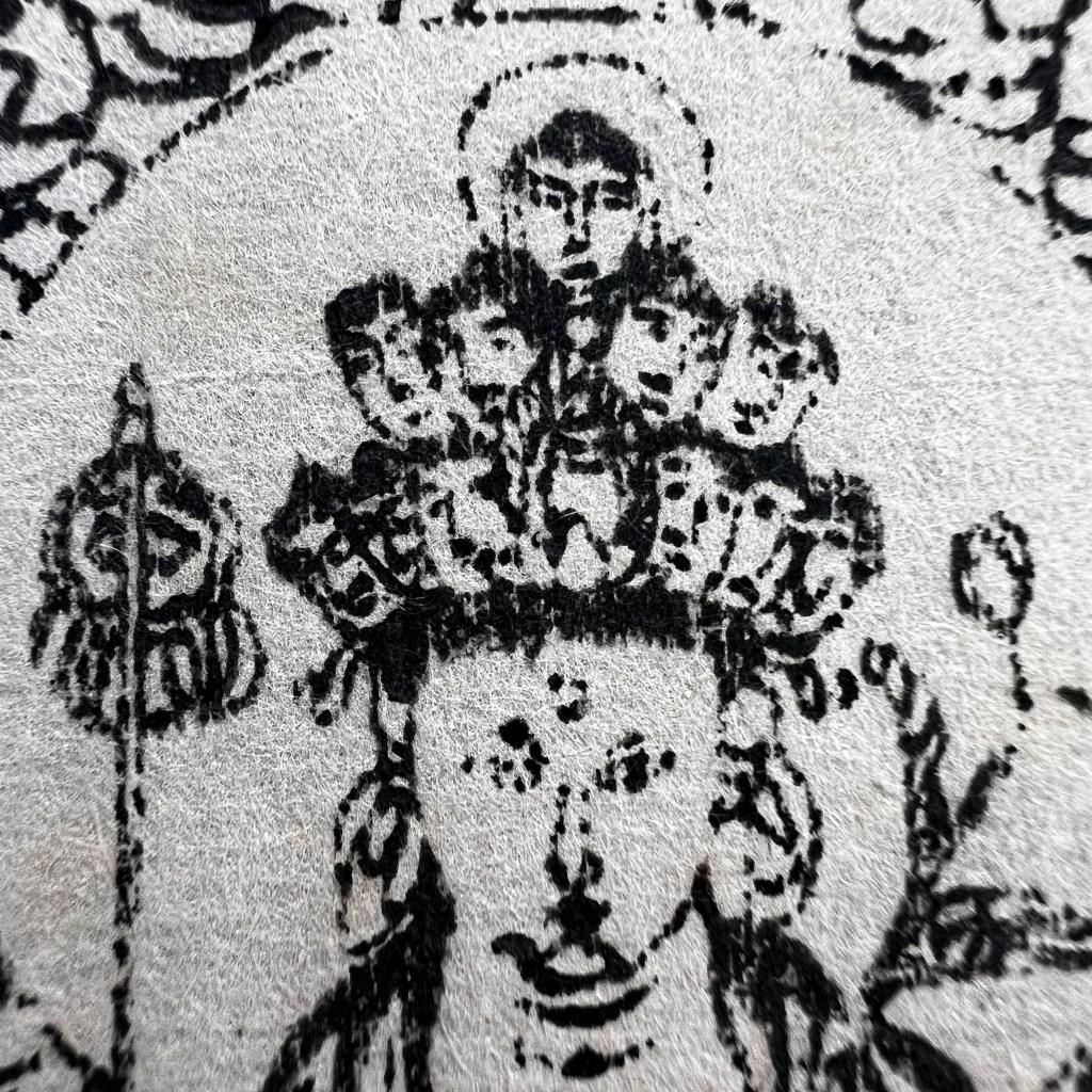 While multi-armed and multi-headed figures are not uncommon in Buddhism, the particular configuration here appears rather fanciful. Nevertheless, we are informed the illustration here represents the Bodhisattva Kannon, further curiously identified in the text as the son of Amida Buddha.