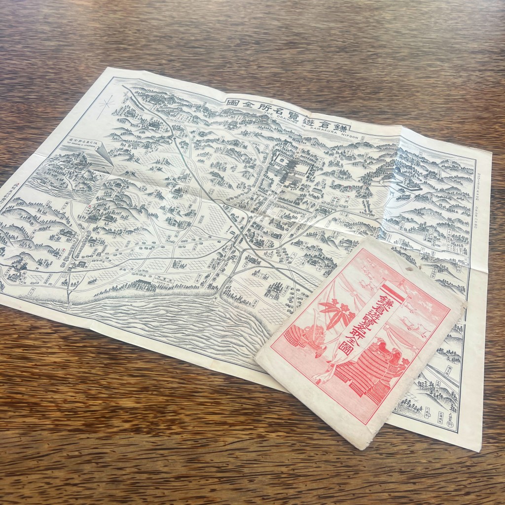 The Complete Map of Kamakura Famous Places for Sightseeing (Kamakura yūran meisho zenzu 鎌倉遊覧名所全圖), loosely rendered into English as The Drawing of Kamakura Nipoon [sic], came inside a paper folder printed with symbols of the Japanese empire. The map was prepared by Kawakami Yasujirō 川上安次郎.