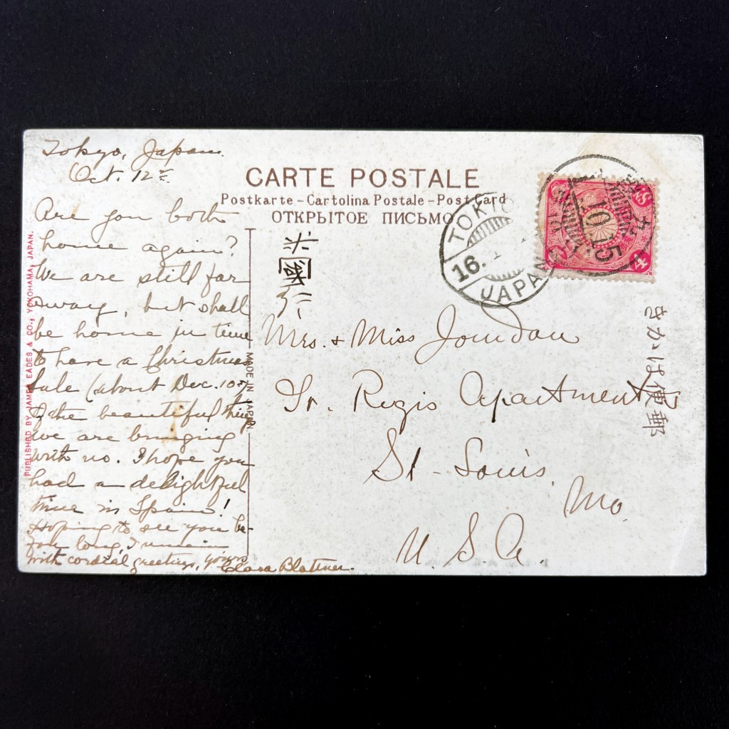 Due to the temple landscaping around the Kamakura Daibutsu, we know this photograph was likely taken between 1903 and 1910. According to the postal mark, the stamp was cancelled on October 15, 1912 (Taisho 1) and mailed to the United States (thus requiring a 4 sen stamp). We also have a rare publisher’s mark along the edge: James Eades & Co., Yokohama, Japan.