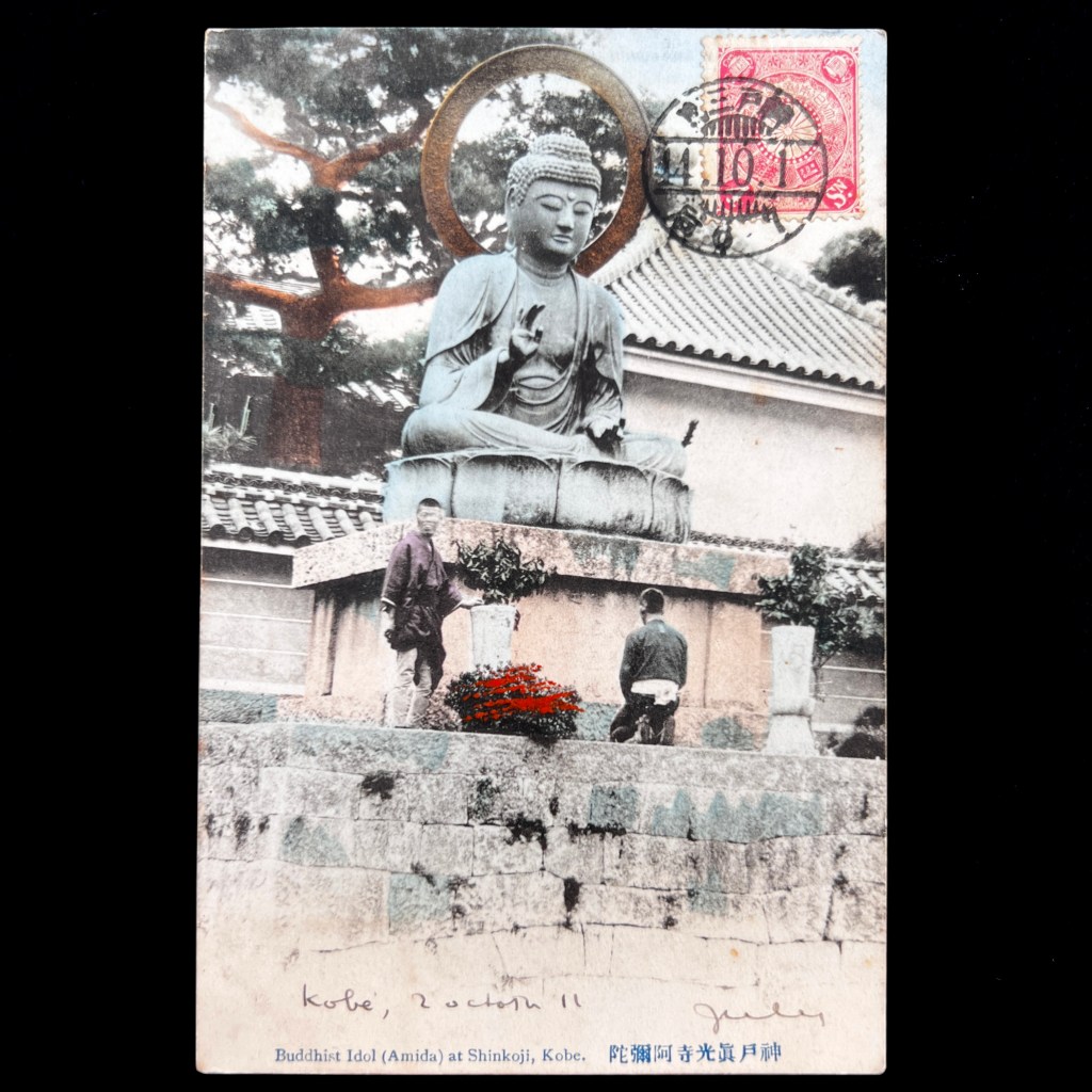 For late Victorian-era globetrotters, religious sites around Japanese port cities were often treated as picturesque tourist destinations. Such a site can be found with the Shinkō-ji lotus pond surrounding a large bronze Buddhist statue, not far from Kobe harbor.