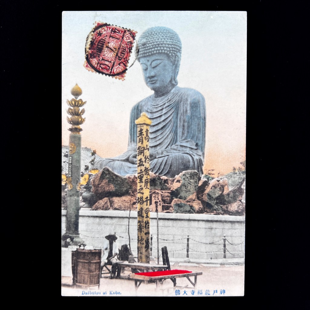 Guidebooks in the early 20th century refer to Nōfuku-ji as a worthy tourist destination when traveling through Kobe. Equally, Japanese postcard companies often used imagery of the Hyōgo Daibutsu; here we see a card made by Ueda Photo, one of the largest publishers during the late Meiji era.