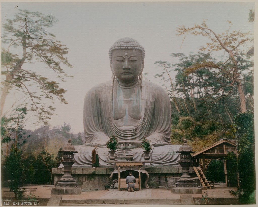 Information: Attributed to Ogawa Kazumasa 小川 一眞 (1860–1929) and published in his Sights and Scenes in Fair Japan from 1910. The second round-the-world cruise of the S.S. Cleveland landed in Japan in late February/early March 1910 and photos of the Daibutsu in the travelogue of William Frizell and George Greenfield depict a similar scene.