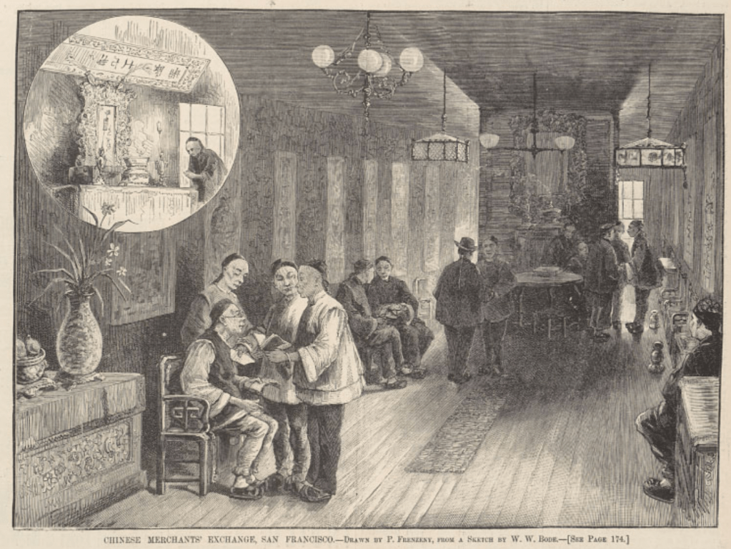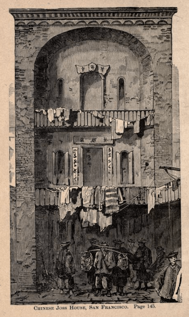 A brief note on dating: When examining secondary research on the history of Chinatown’s temples one will often run into different dates for a particular temple’s founding. On one hand, this is due to a conflation between the formal organization of a district association and the construction of a district association building, two distinct events that may be separated by many years. For example, while the Ning Yung Association organized in 1853, the earliest mention of an association building with shrine hall is 1864, an eleven-year gap. I am interested in the building of Chinese temples, often reported with fanfare in news media, which allows us to focus attention on the reception and influence of Chinese material culture in the United States. On another hand, not only did the 1906 earthquake and fire destroy Chinatown’s religious buildings, but also almost all district association and fraternal society records. Some of the associations or temples claiming to date to the 1850s, for example, are often relying on oral histories. This is valuable data that must be viewed in conjunction with other available historical records. As of this writing, the most detailed information regarding the history of Chinese temples in San Francisco is Chuimei Ho and Bennet Bronson’s Chinese Traditional Religion and Temples in North America, 1849–1920: California (2022). Some of my observations below supplement their analysis.