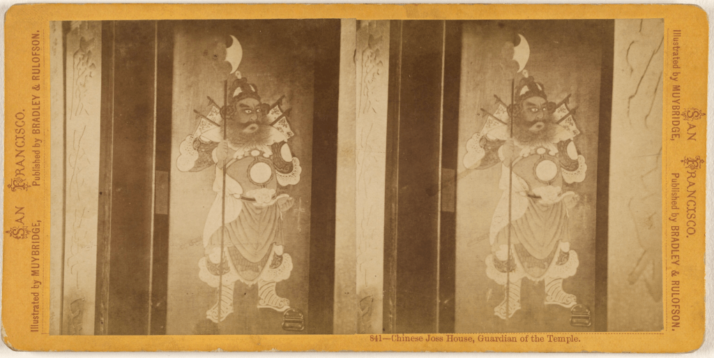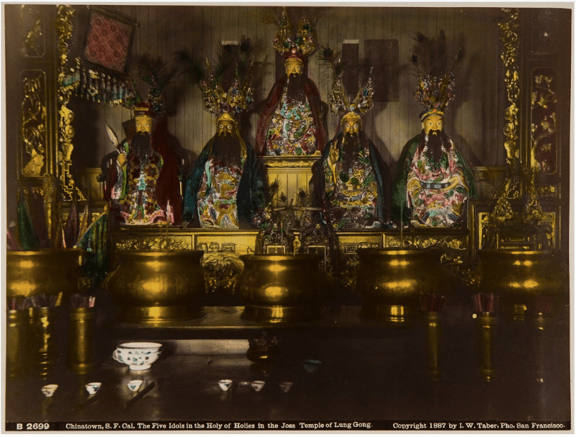 I.W. Taber, “B 2699 Chinatown, S. F. Cal. The Five Idols in the Holy of Holies in the Joss Temple of Lung Gong,” 1887. [source]