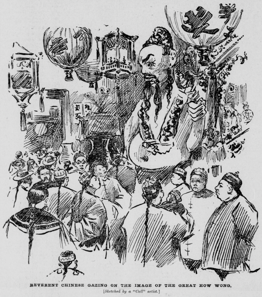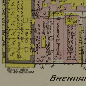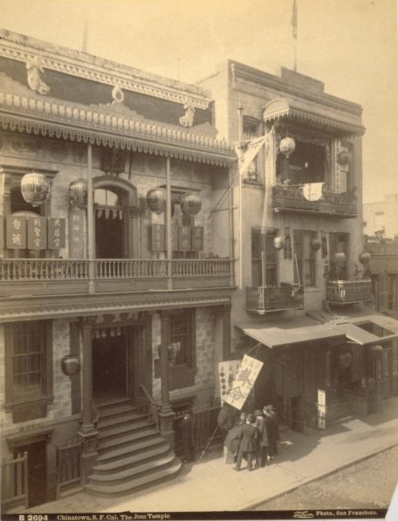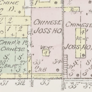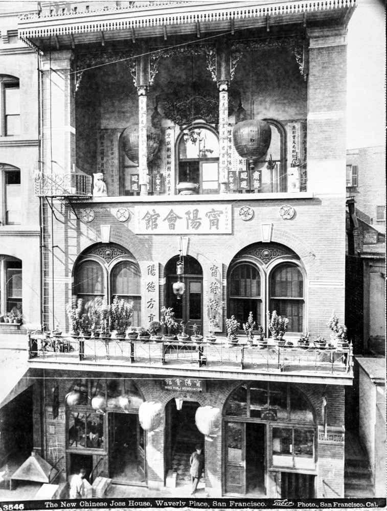 This map locates many of the Chinese temples built in San Francisco before the 1906 earthquake and fire. Known generically as miao 廟 (or miu in Cantonese), meaning temple or shrine hall, most of the non-Chinese American public referred to these structures as “joss houses” in the nineteenth century. A principle function of these temples, from which their American name derived, was to house Chinese religious icons, commonly called “joss.” Rarely, however, did urban temples occupy a whole building; temples were more typically shrine halls located on the top floor of a multi-story structure. Moreover, these temples were not operated by religious institutions, but were owned and operated by various community organizations. A handful seem to have been privately owned. Often the largest temples were operated by different district associations (huiguan 會館), while many other temples were run by secret fraternal organizations (tang 堂) or various associations organized around clan lineages or trades. Many temples, especially privately owned ones, enshrined numerous icons that could be worshiped for an array of reasons, but sometimes a temple was dedicated to a single figure who functioned like the patron deity of the association or guild. This icon was placed in the central altar of the main shrine hall. In the case of larger district association buildings, the lower floors were typically used for non-religious functions, such as meeting rooms, short-term lodging, or other work spaces necessary for the operation of the organization.