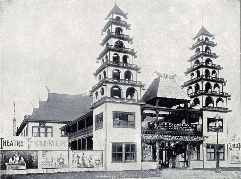 Chinese Village, Theatre, and Joss House, Midway Plaisance: The Columbian Exposition was divided into two sections. The first was comprised mainly of large neoclassical buildings which housed the displays of international exhibitors. Known as the White City (or Dream City), this section was interpreted as by contemporary visitors and modern scholars as the utopian vision of a good, modern life. In contrast to the educational function of the exhibits in the White City, the carnivalesque amusement concession, known as the Midway Plaisance, was in the words of Robert Rydell, the “honky-tonk sector” of the fair. [Rydell 1978: 255]. Under the supervision of Sol Bloom, the Midway was principally a commercial endeavor, populated by displays installed by private entrepreneurs. The Wah Mee Exposition Company, operated and financed by three Chinese immigrants, opened a building complex that housed a Chinese theater, tea house (in some maps erected separately on the southern side of the Midway walkway), restaurant, shopping bazaar, shrine hall, and living diorama of daily life in a Chinese village. The shrine hall, adopting the common American nomenclature of “joss house,” was located on the second floor of the large building in the rear of the concession space. While some fair-goers describe the entirety of the hall as “Buddhist,” photographs reveal a relatively typical Chinese American shine populated with folk deities, semi-historical figures, and tutelary gods. It is very likely an image of Bodhisattva Guanyin was included on the altar, although I cannot clearly locate one in the surviving souvenir photographs. Textual accounts also note an additional display of Yama’s Ten Courts of Hell where different figures are represented in various modes of karmically determined tortures. Although the concession was created for tourists, the joss house appears to have been a fully functional shrine hall. At the closing of the fair, the contents of the joss house were auctioned off, but a few items were sold to the Field Museum, including a set of fortune sticks.
