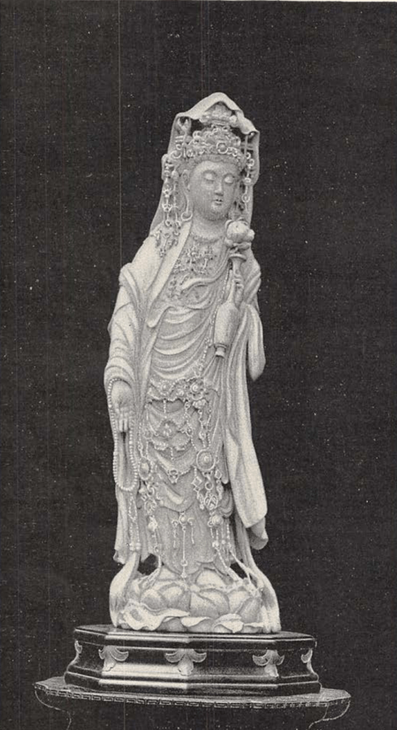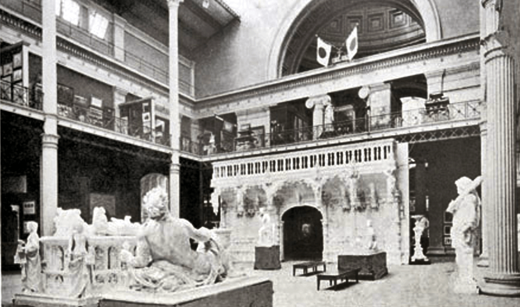 Japanese Exhibit, Palace of Fine Arts: For the first time in the history of World Fairs, Japan was allowed to present works under the category of Fine Arts at the Columbian Exposition. Of the hundreds of works submitted and put on display, about a dozen pieces directly represented Buddhist figures, Buddhist architecture, or Buddhist themes more generally. Japanese artworks occupied two areas in the Palace of Fine Arts, one on the main gallery in the west wing [Fig. 2] and the other on the second floor gallery surrounding three of the four sides of the central rotunda [Fig. 3]. Some of the most stunning sculptural pieces were Buddhist inspired and placed at the front and center of these exhibition spaces. Guarding one side of the entrance to the Japan exhibit on the main concourse was a giant bronze image of a fierce Buddhist figure who often protects the entrance of Japanese Buddhist temples, named Shukongōjin 執金剛神 (S. Vajradhāra)[Fig. 2]. This image was cast by Okazaki Sessei 岡崎雪聲 (1854–1921) and is currently owned by the Waseda University Aizu Yaichi Memorial Museum. A carefully carved miniature replica of the Yasaka Pagoda 八坂の塔 , executed by Niwa Keisuke 丹羽圭介 (1856–1941), was also placed in the alcove in front of the entrance [Fig. 2]. Lastly, a smaller image of Kannon Bodhisattva in ivory, carved by Ishikawa Kōmei 石川光明 (1852-1913), was also positioned at the entrance [Fig. 5]. One the second floor gallery overlooking the east court we find an expressive rendition of Gigeiten 技芸天 (S. Sarasvatī), a minor Buddhist deity who is considered a patron of the arts [Figs. 4 & 6]. This piece was carved in wood by Takenouchi Kyuichi 竹内久一 (1857–1916) and is currently owned by the University Art Museum at Tokyo University of the Arts.