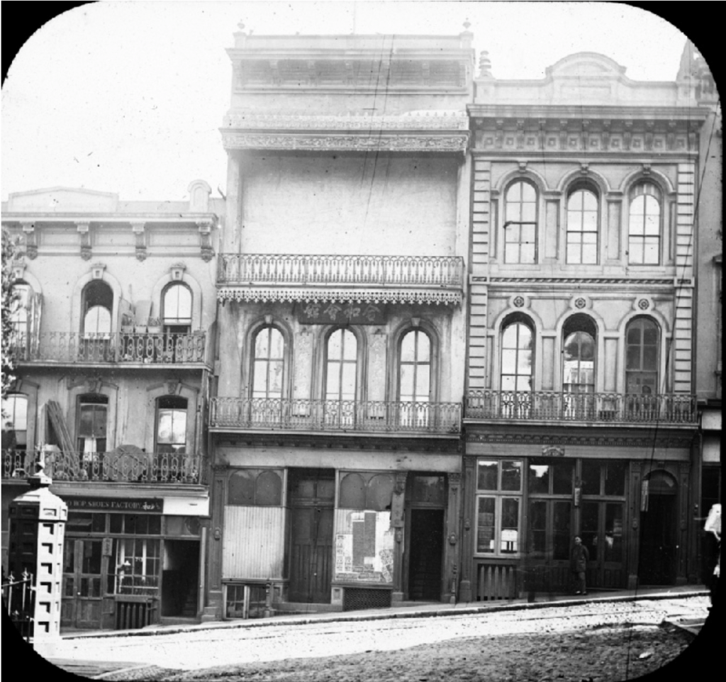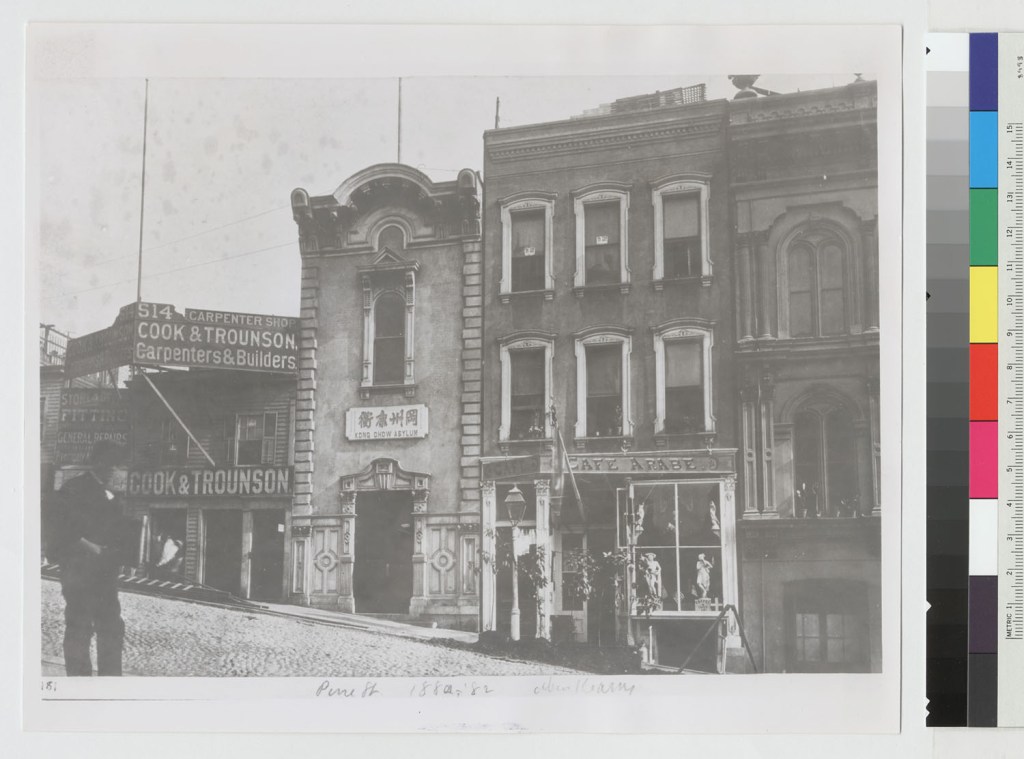 Some of oldest temples in Chinatown are thought to be the Tin How Temple [#14] and the Kong Chow temple [#X1], both often claimed to have been built in the early 1850s, but this is not without some dispute. The earliest media report of a Chinese temple in San Francisco – characterized variously as a heathen, pagan, and idol temple in newspaper accounts – appears in fall 1851, but the temple’s identity and affiliation remains unknown. The earliest identifiable temple is the Yeong Wo Association building, built on the southwestern slope of Telegraph Hill in fall 1852. Both of these predate the Sze Yup Association temple, sometimes mistakenly considered the first Buddhist temple in the United States, which was constructed on a corner lot on Pine Street and Kearny Street in 1853 [see #X1 below]. By the 1880s, Waverly Place, the two-block road between Sacramento Street and Washington Street, was known among the Chinese as Tin How Temple Street (Tianhou miao jie 天后廟街) and became the home to the greatest density of Chinese temples before the 1906 earthquake.